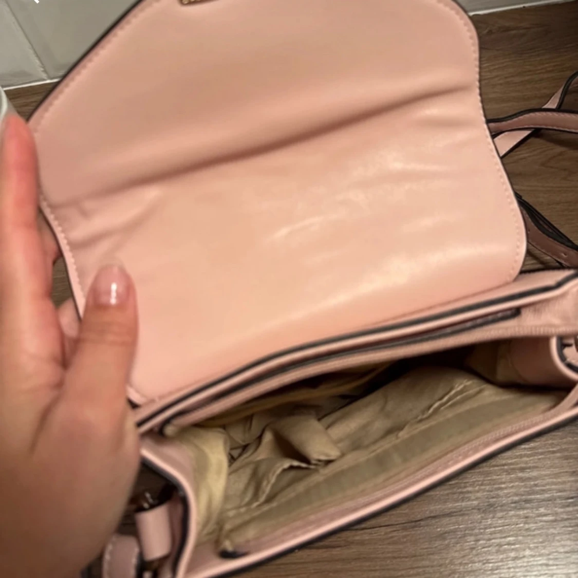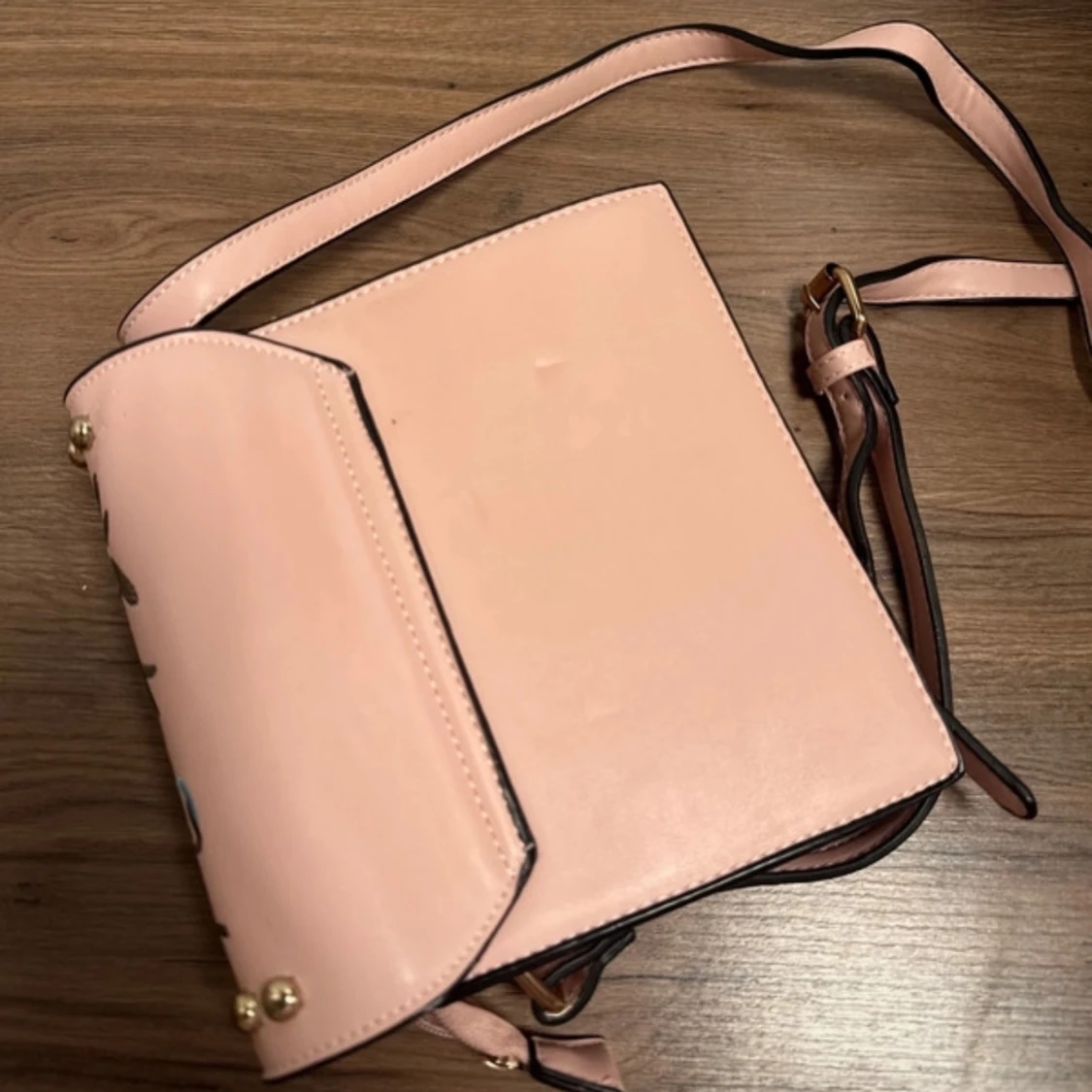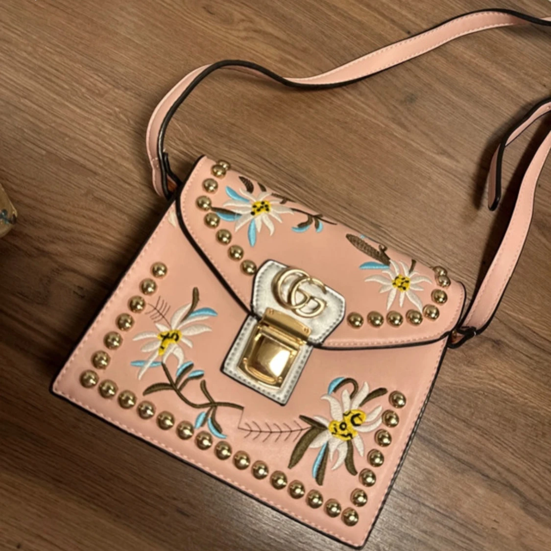 Säljer en söt rosa axelväska med vackert blommigt broderi och guldfärgade nitar. Väskan har en elegant låsdetalj framtill och justerbar axelrem. Perfekt för att ge en färgklick till din outfit!