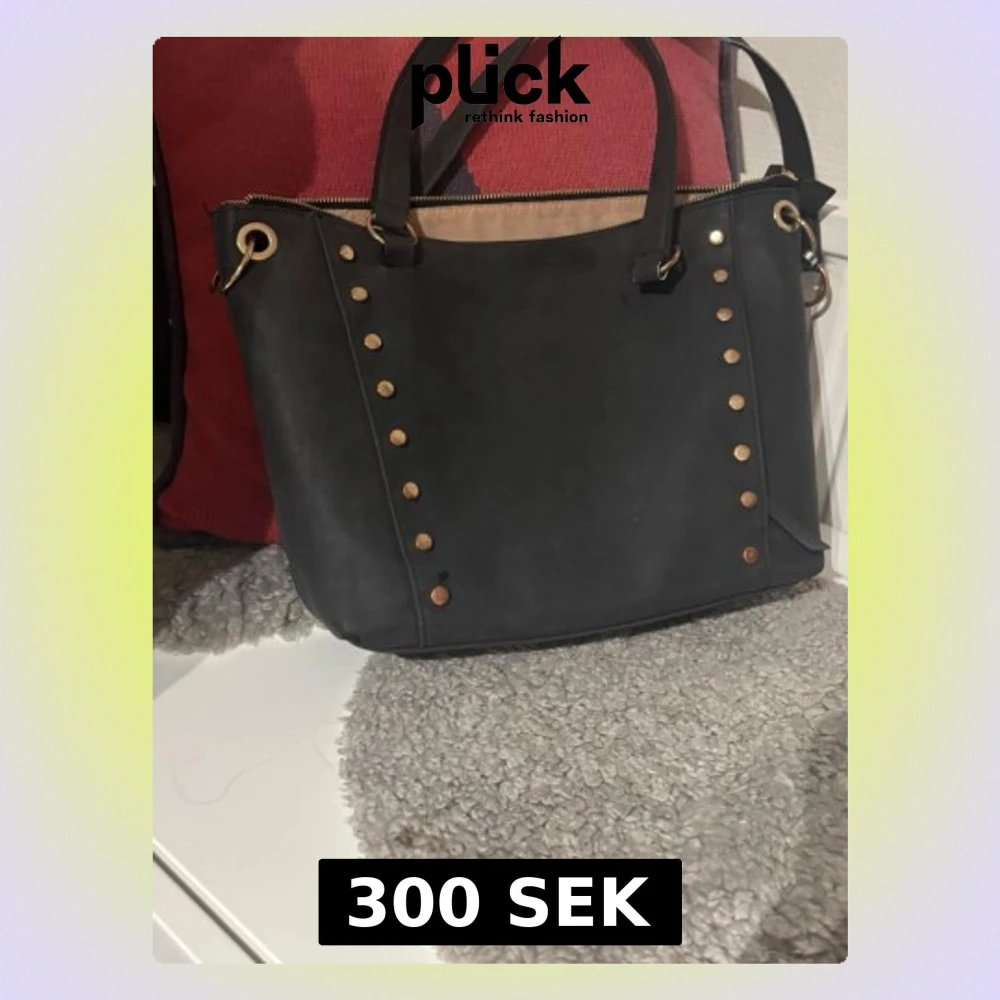 Snygg svart handväska med guldfärgade nitar längs sidor sopm ger en cool touch. Väskan har två handtag och dragkedja upptill. Perfekt för dig som vill ha en stilren men ändå edgy accessoar.