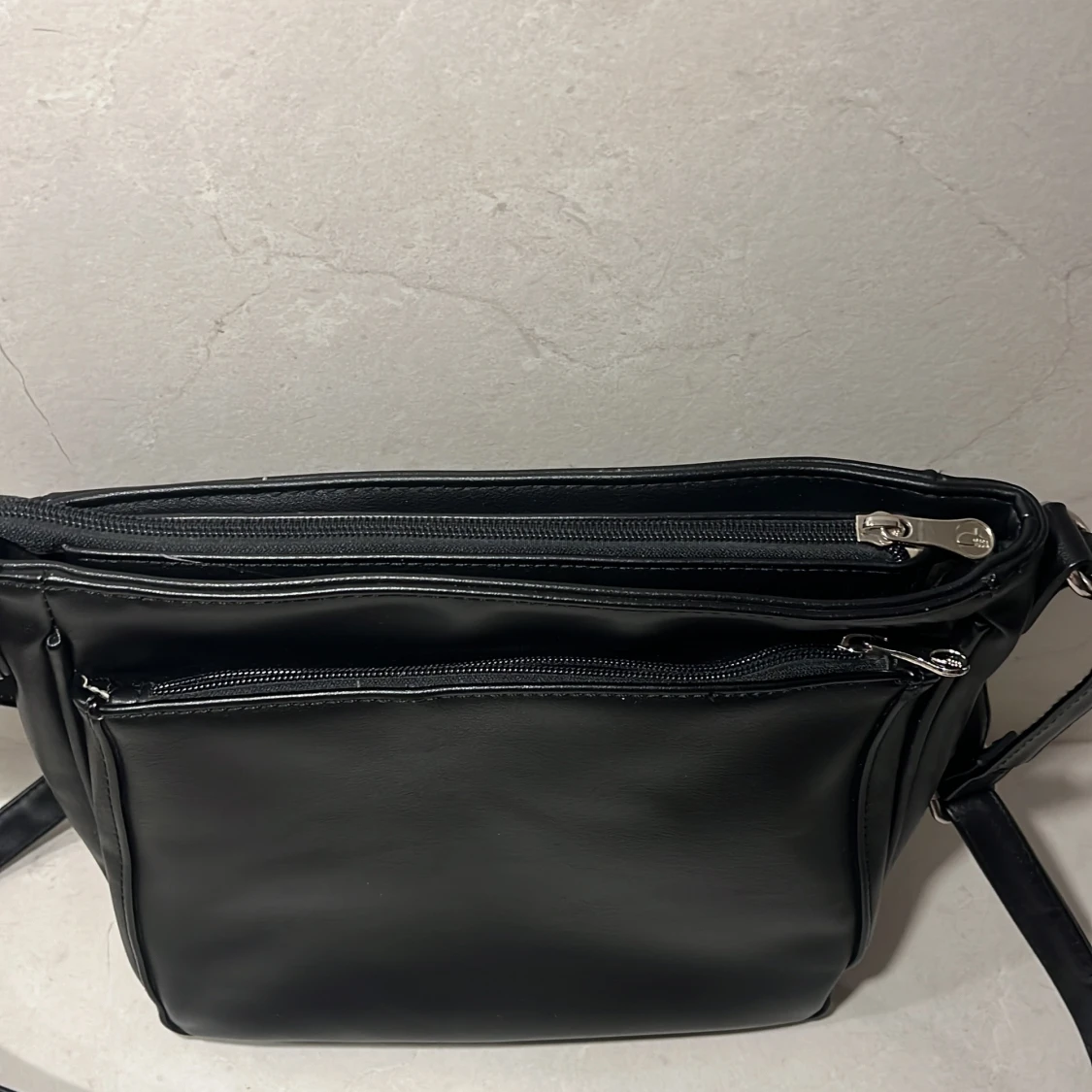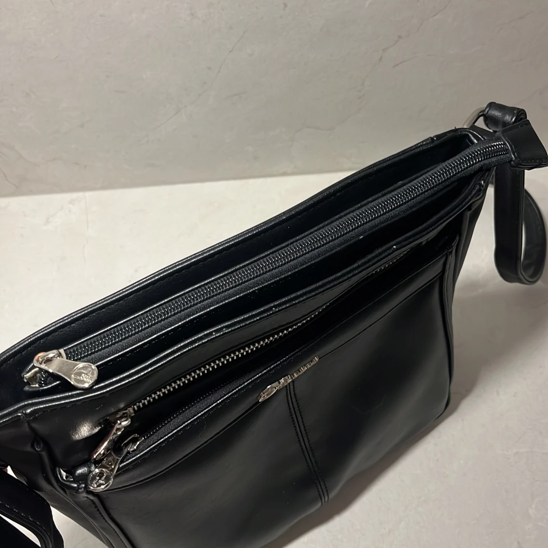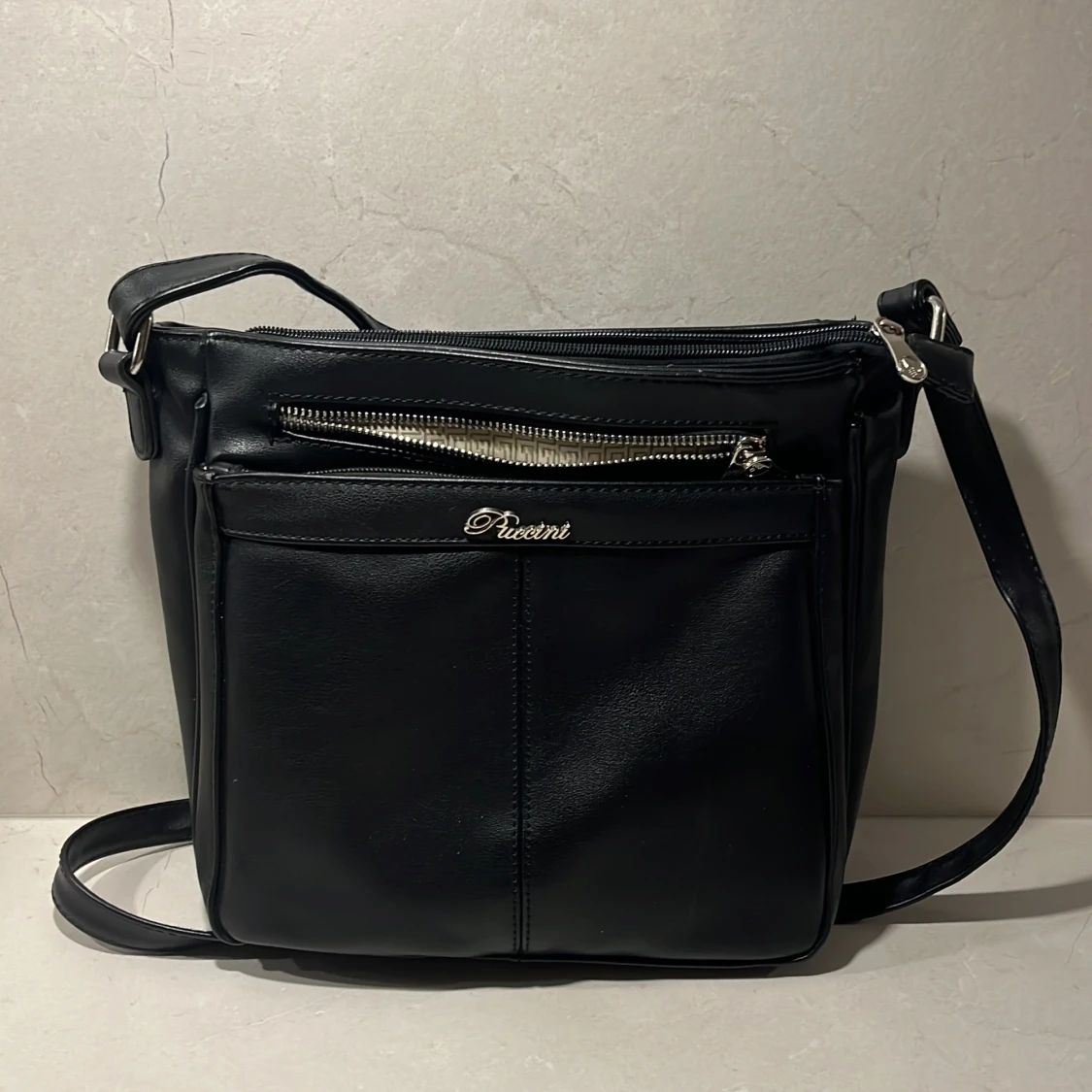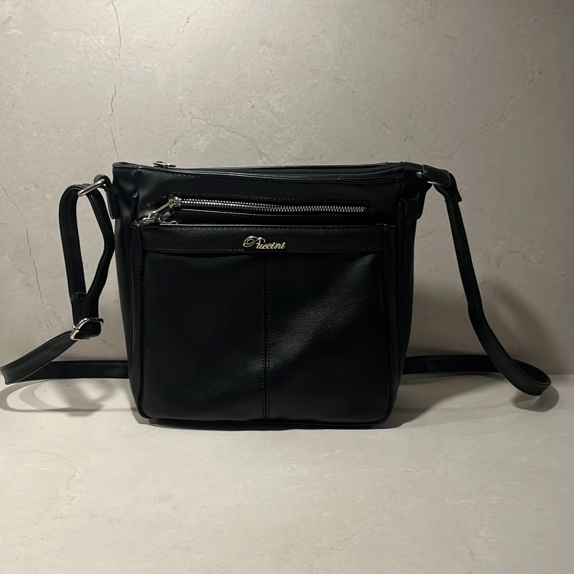 Snygg svart axelväska från Puccini i skinn med flera praktiska dragkedjefickor. Perfekt för att hålla ordning på dina saker. Justerbar axelrem för bekväm passform. Superfint skick!