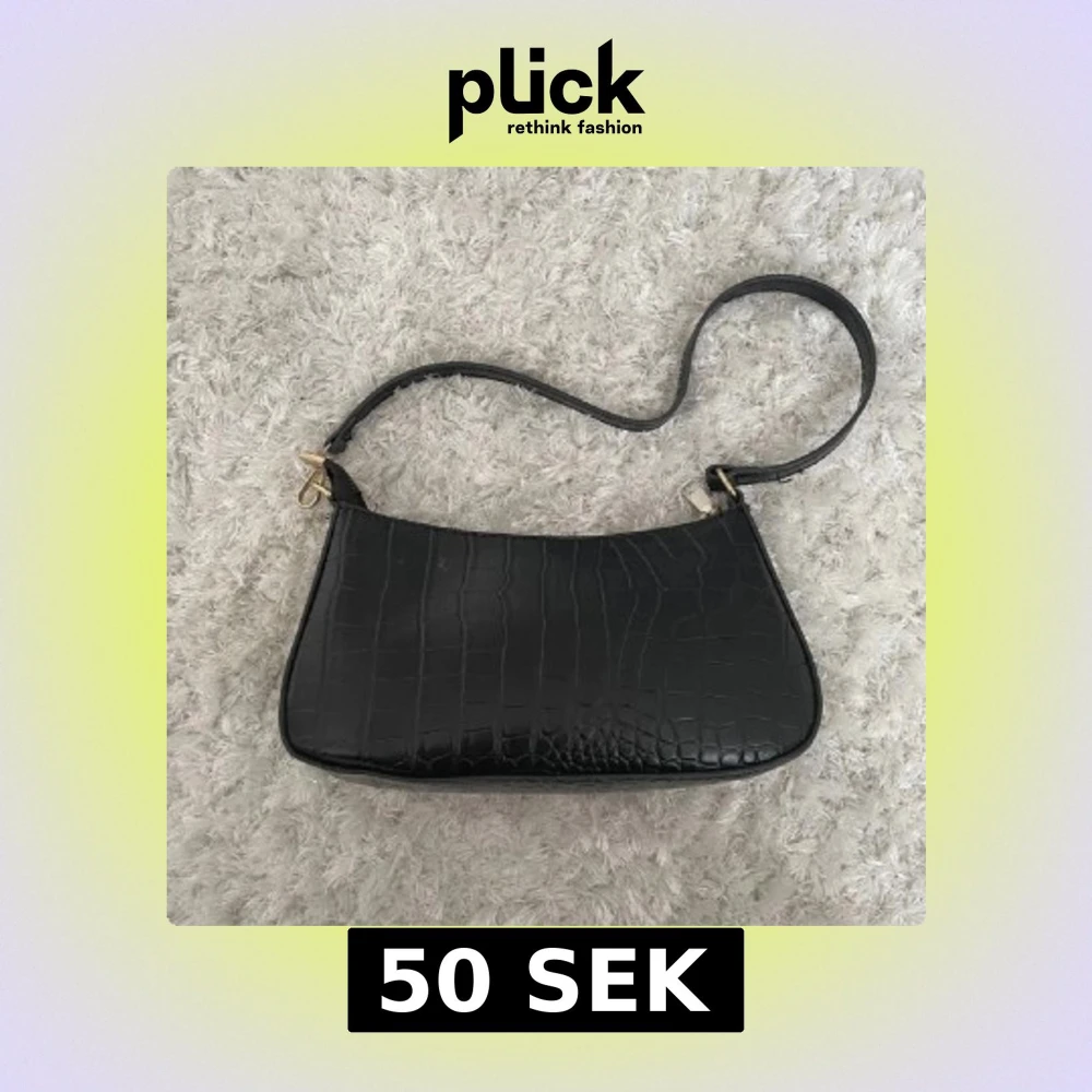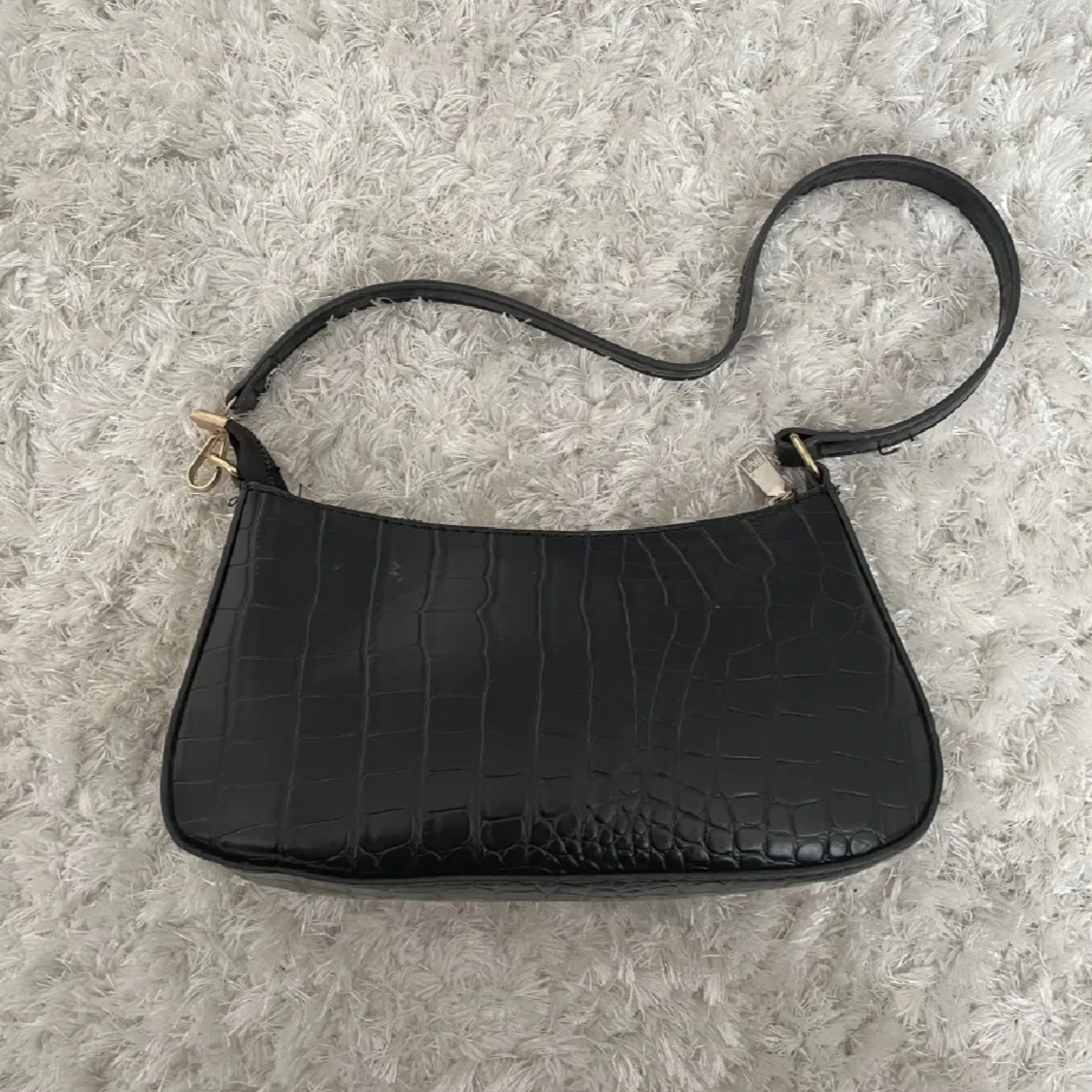 Snygg svart axelväska med krokodilmönster och guldfärgade detaljer. Perfekt för att ge en elegant touch till din outfit. Väskan har en justerbar axelrem och stängs med dragkedja.