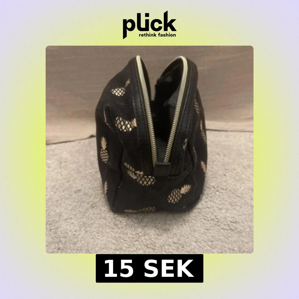 Snygg svart necessär med guldiga ananaser och dragkedja. Perfekt för att förvara smink eller småsaker. Kompakt och lätt att ta med sig. Dock har den några smutsfläckar men det får förmodligen att få bort.