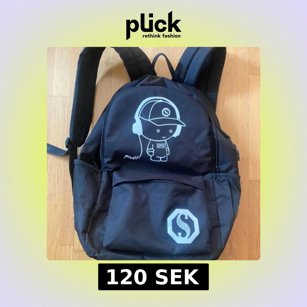 Cool svart ryggsäck från Senkey & Style med vit tecknad figur med hörlurar på framsidan. Ryggsäcken har flera fack, meshfickor på sidorna och en USB-port för laddning. Perfekt för skolan eller stan.