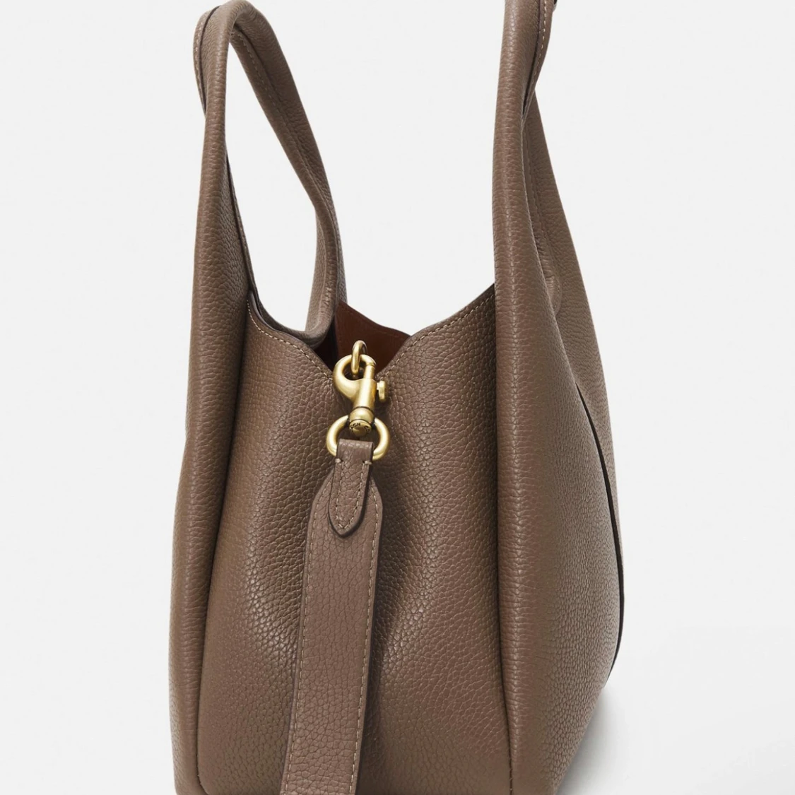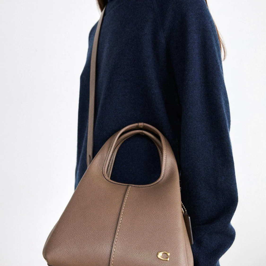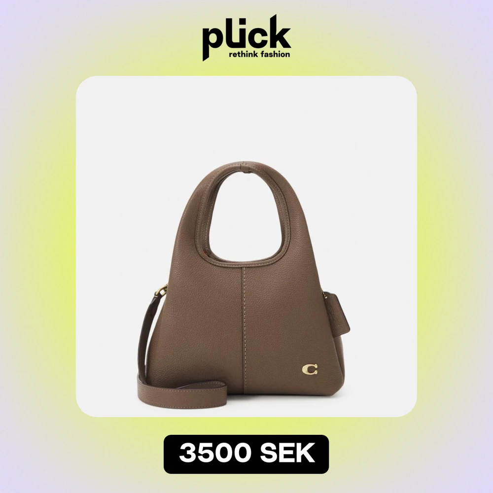 Snygg brun axelväska från Coach i skinn. Den har en unik form med ett stort handtag och en justerbar axelrem. Väskan är stilren med en liten guldfärgad logga på framsidan. Perfekt för både vardag och fest!✨
