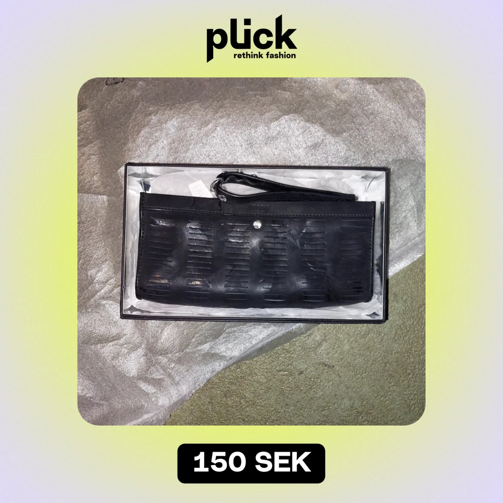 Snygg svart kuvertväska i skinn med coolt mönster och en glittrig detalj från Swarovski. Perfekt för en festkväll! Väskan har en praktisk handledsrem och kommer i originalförpackning.