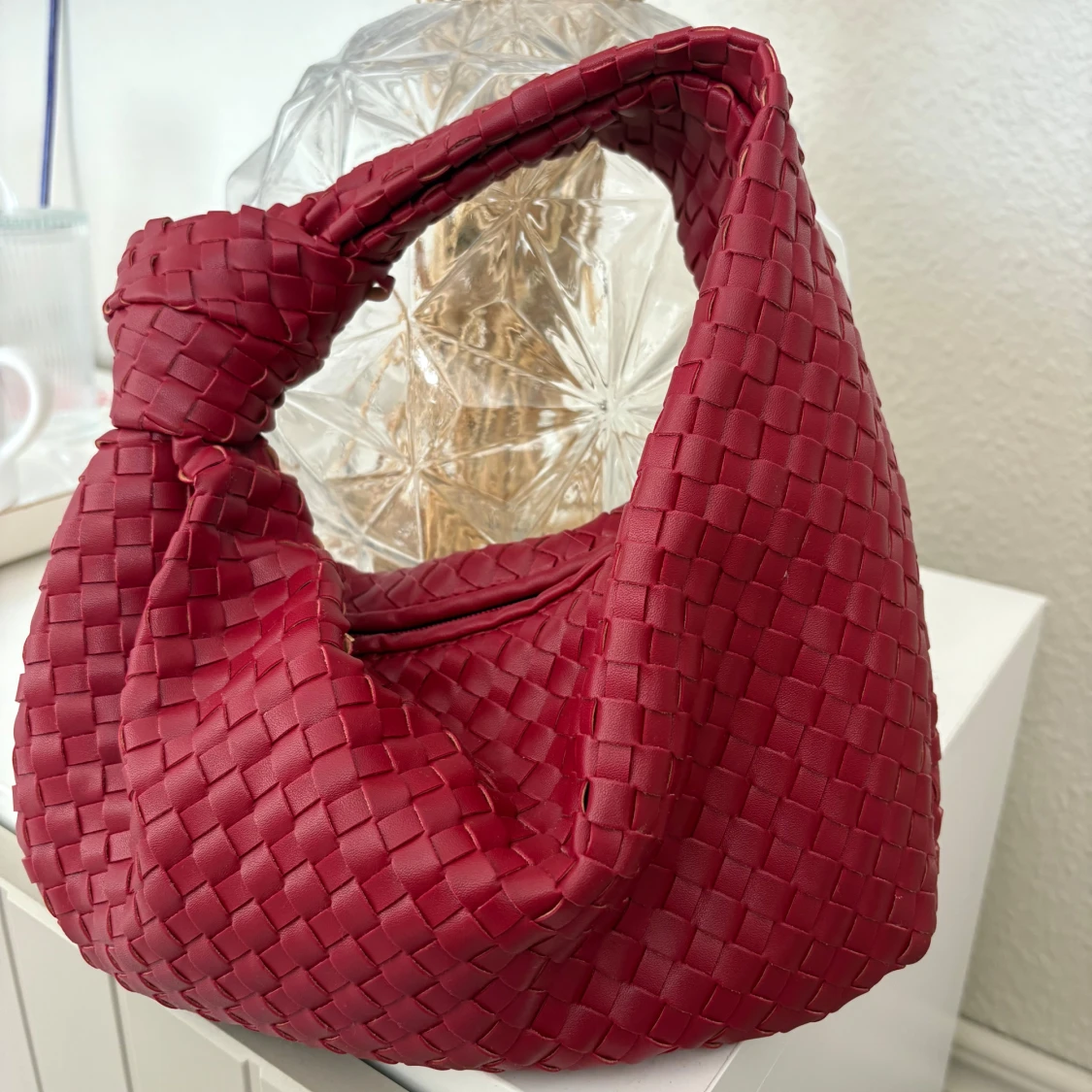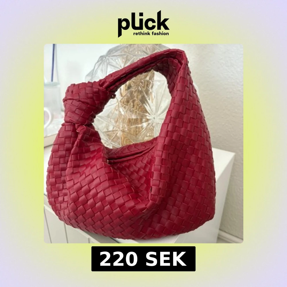 Snygg röd handväska med flätad design och en cool knut på handtaget. Väskan har en mjuk, rundad form och stängs med dragkedja. Materialet är skinnimitation som ger en lyxig känsla. Perfekt för dig som vill sticka ut med en unik accessoar.