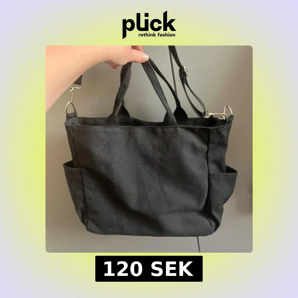 En stilren svart axelväska i bomull med både handtag och justerbar axelrem. Väskan har flera praktiska ytterfickor och stängs med dragkedja upptill. Perfekt för dig som vill ha en enkel och rymlig väska till vardagen.