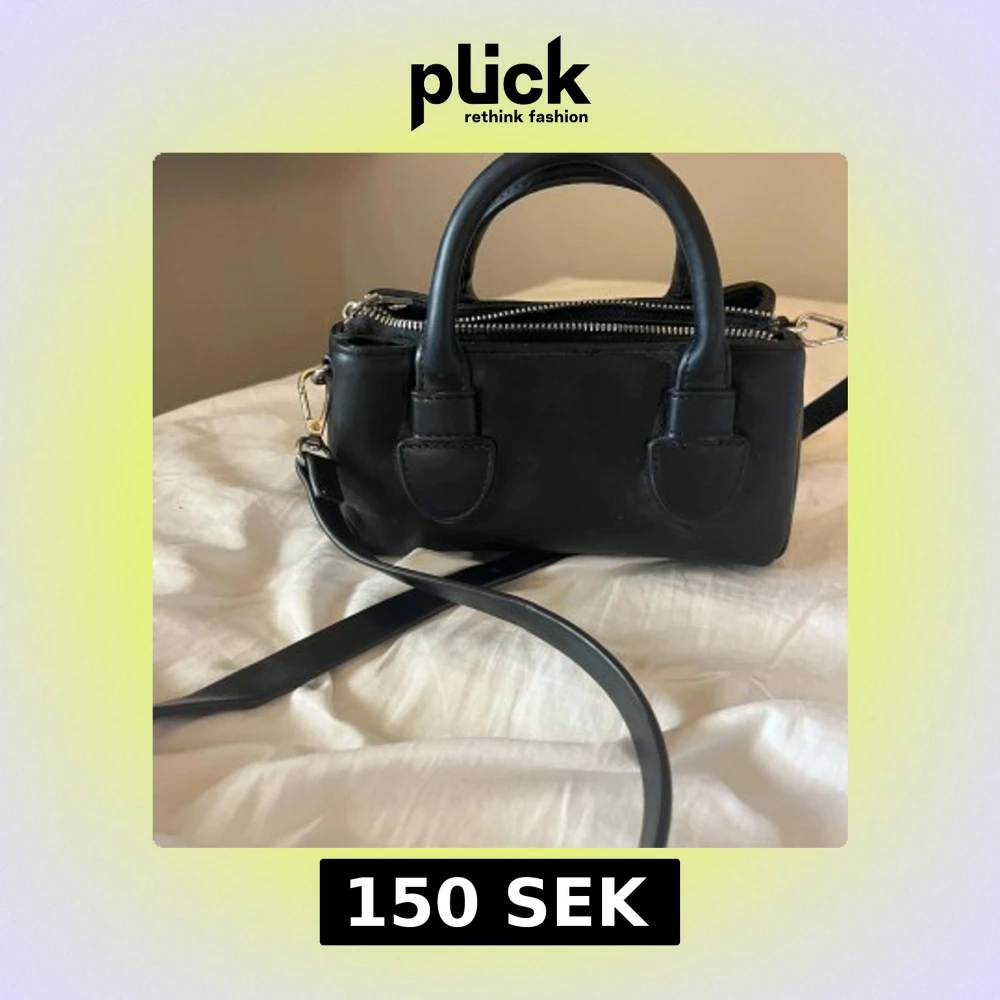 Säljer en stilren svart minihandväska i skinn med både handtag och avtagbar axelrem. Väskan har flera fack och en silvrig dragkedja upptill. Perfekt för dig som vill ha en kompakt och snygg accessoar till vardagen.
