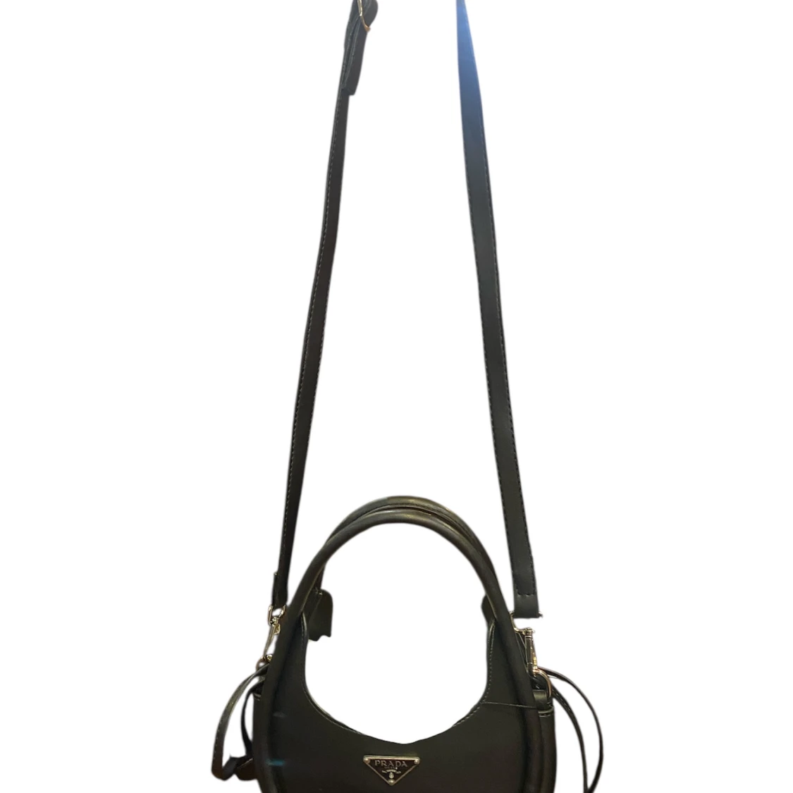 Snygg svart handväska i skinn med unikt rundad form och vita tygdetaljer upptill. Väskan har dubbla handtag, dragsko i tyg och klassisk framtill. Perfekt för dig som vill ha en stilren och trendig accessoar.