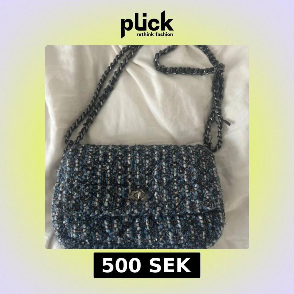 Snygg axelväska i blått och vitt med ett stilrent rutigt mönster. Väskan har en kedja som axelrem och ett praktiskt innerfack med dragkedja. Perfekt för att ge din outfit en trendig touch. Jätte fint skick