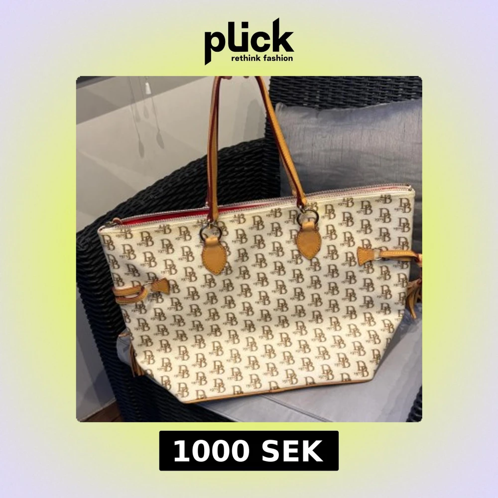 Stor shoppingväska från Dooney & Bourke i beige med bruna detaljer och logomönster över hela väskan. Väskan har långa handtag i brunt skinn, dragkedja upptill och dekorativa tofsar på sidorna. Perfekt för dig som vill ha plats för allt du behöver under dagen.