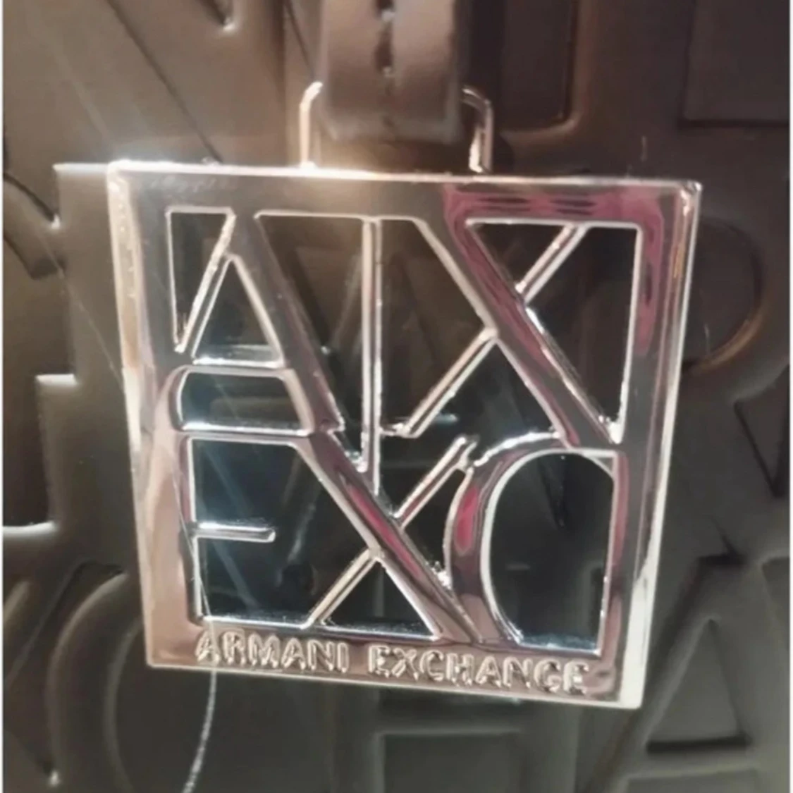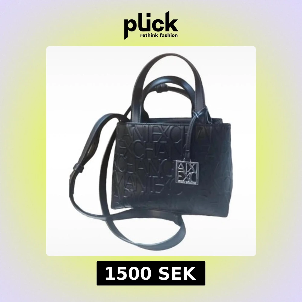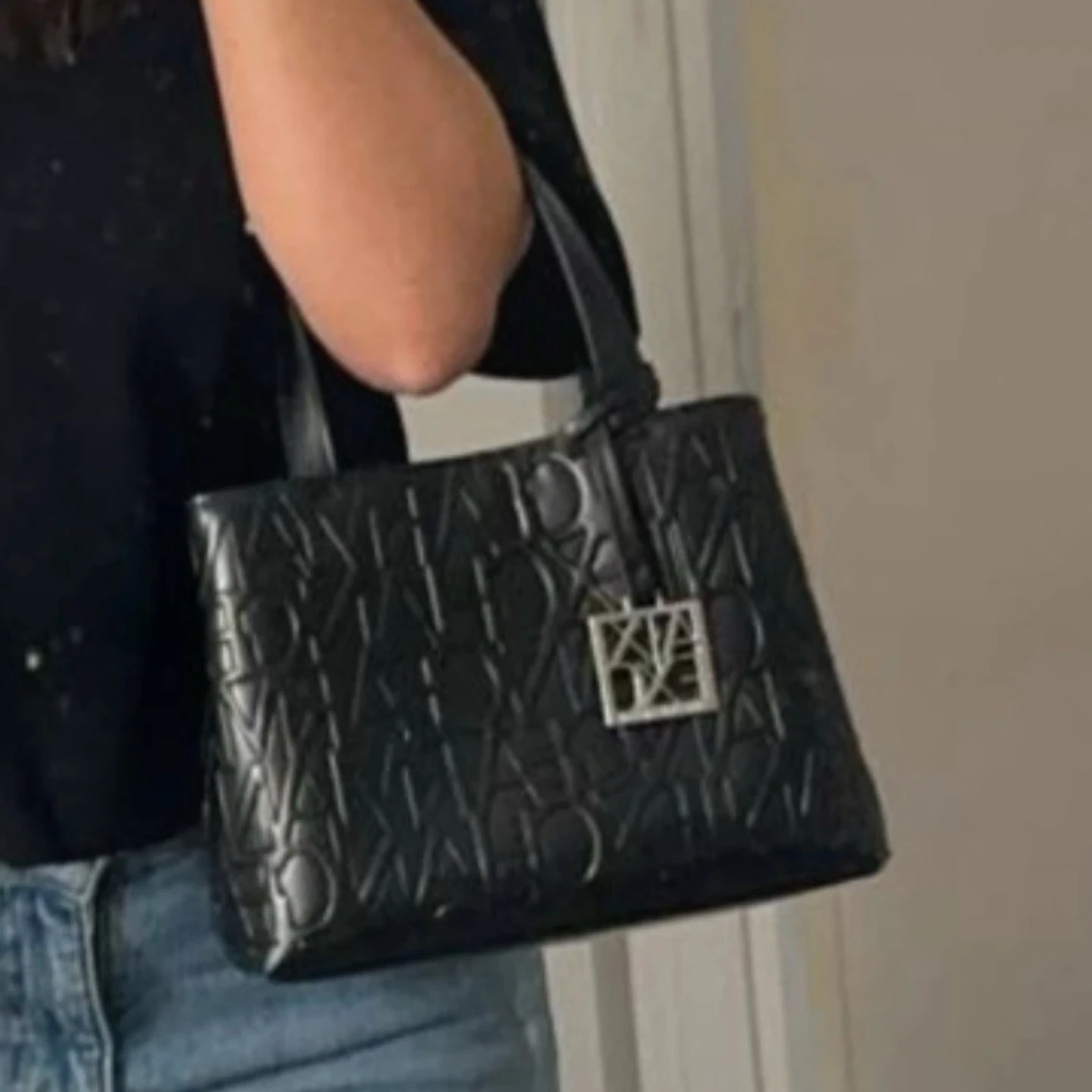 Snygg svart handväska från Armani Exchange med präglad logotyp över hela väskan och en silverfärgad metallbricka framtill. Väskan har både handtag och justerbar axelrem, perfekt för att bära på olika sätt. Tillverkad i skinn med stilren, fyrkantig form. Mått bredd: 16cm höjd: 22cm