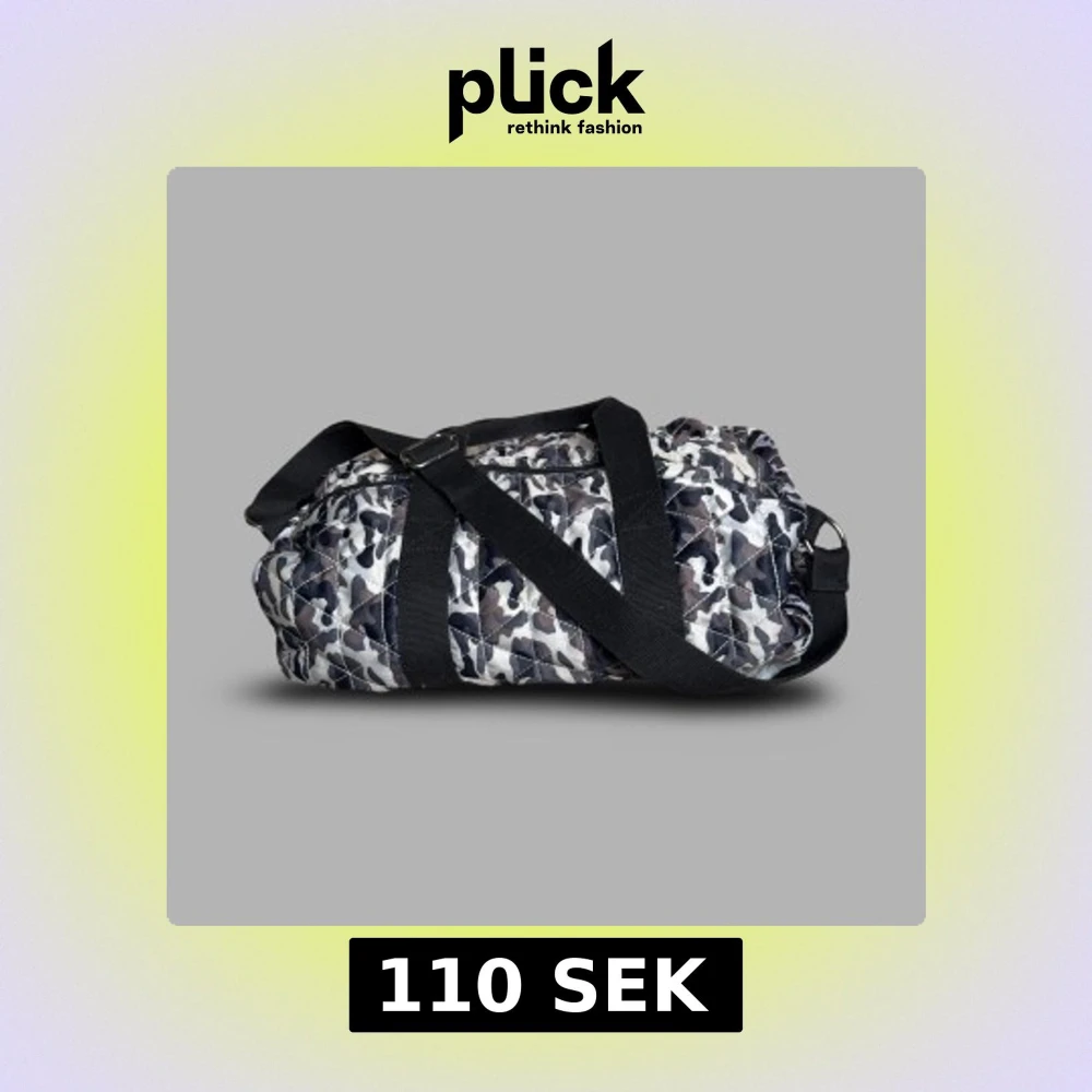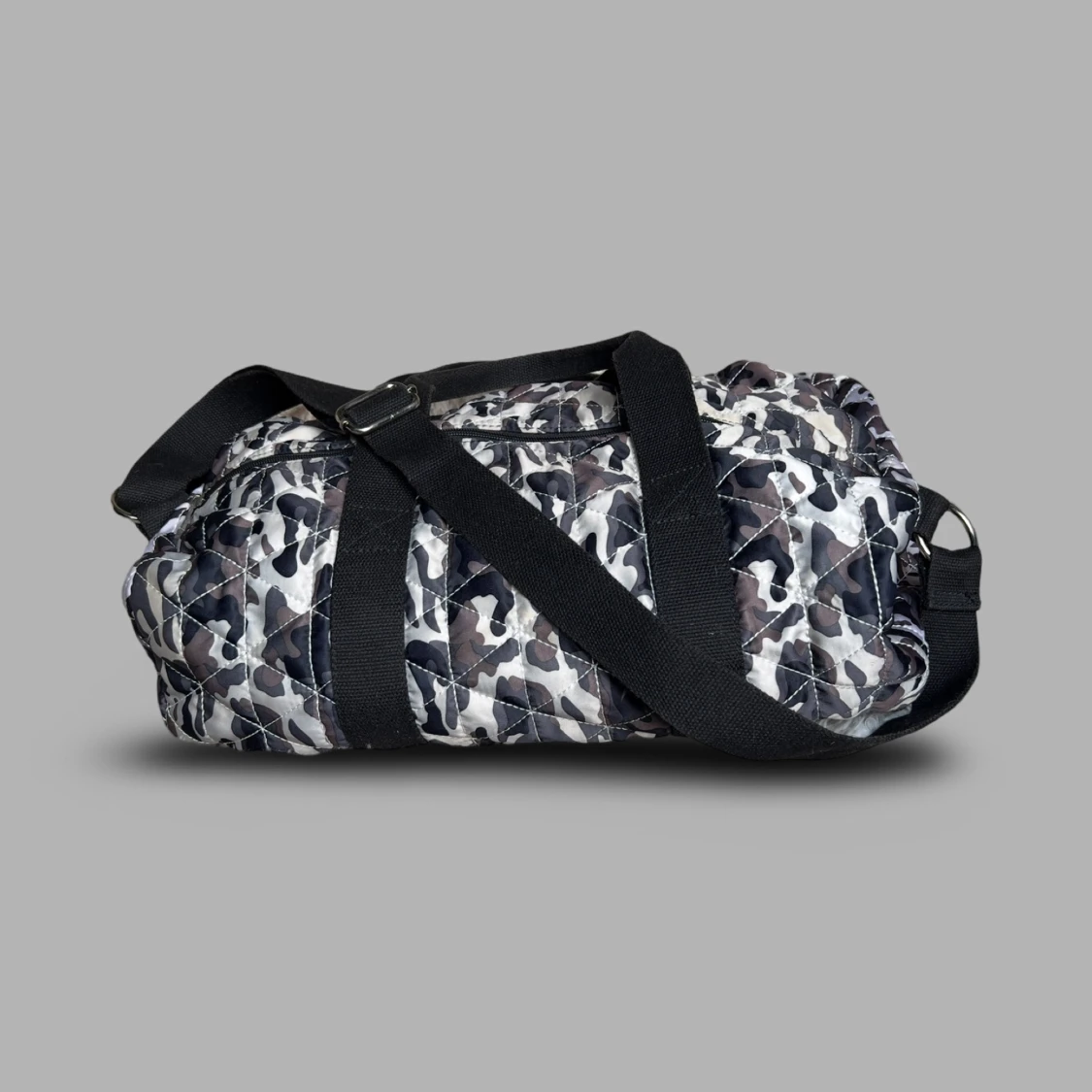 Säljer en quiltad träningsväska med camouflagemönster i svart, beige och brunt. Väskan har både handtag och justerbar axelrem i svart tyg samt dragkedja upptill. Perfekt storlek för gymmet eller sportaktiviteter.