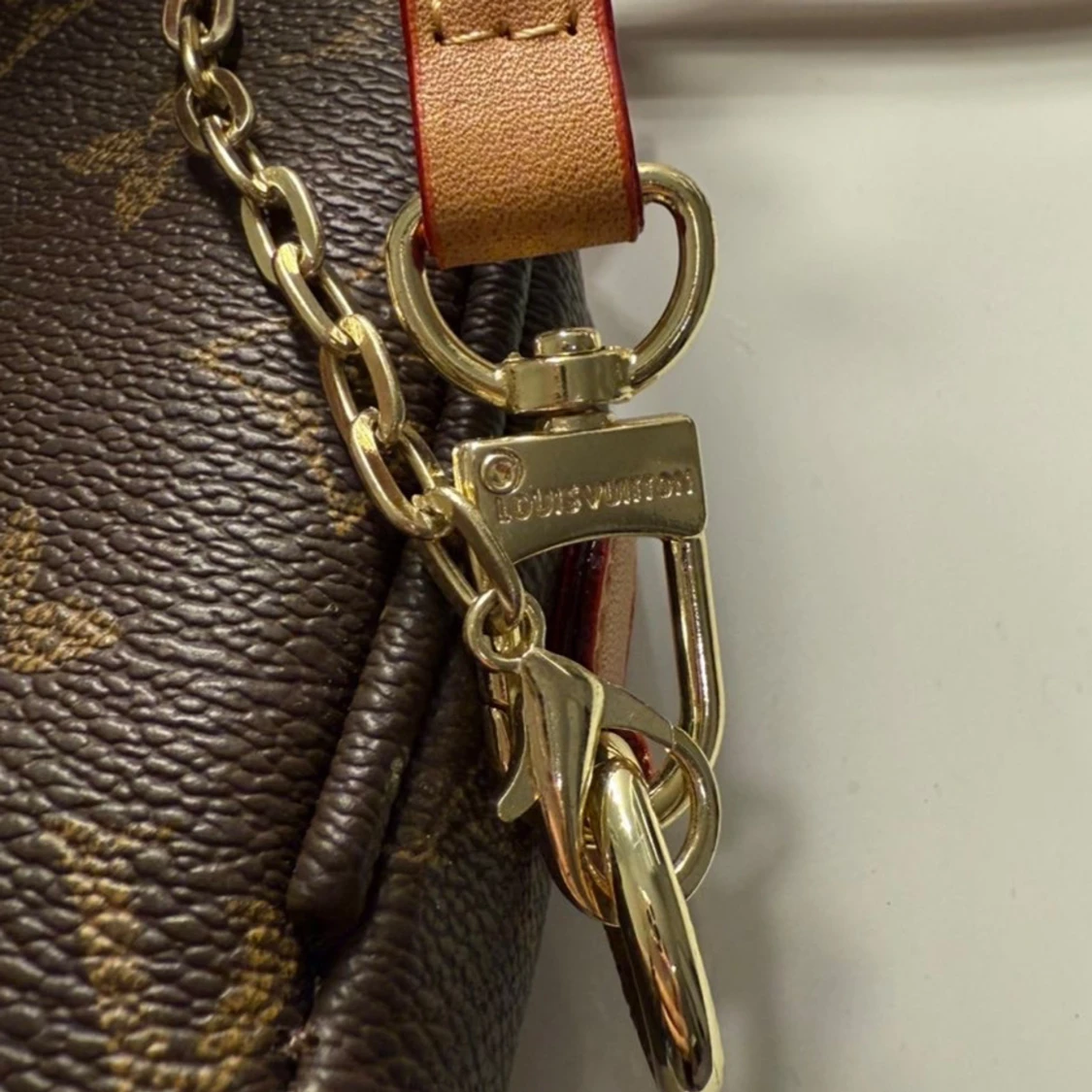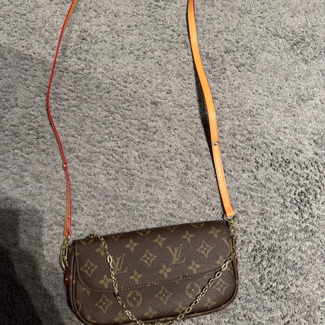 Snygg brun axelväska med klassiskt monogrammönster i brunt. Väskan har guldfärgade metalldetaljer, kedja och justerbar rem som går av i läder med röda och beige inslag. Dustbag och (skadad) låda tillkommer. Helt ny Boxfresh!🧡