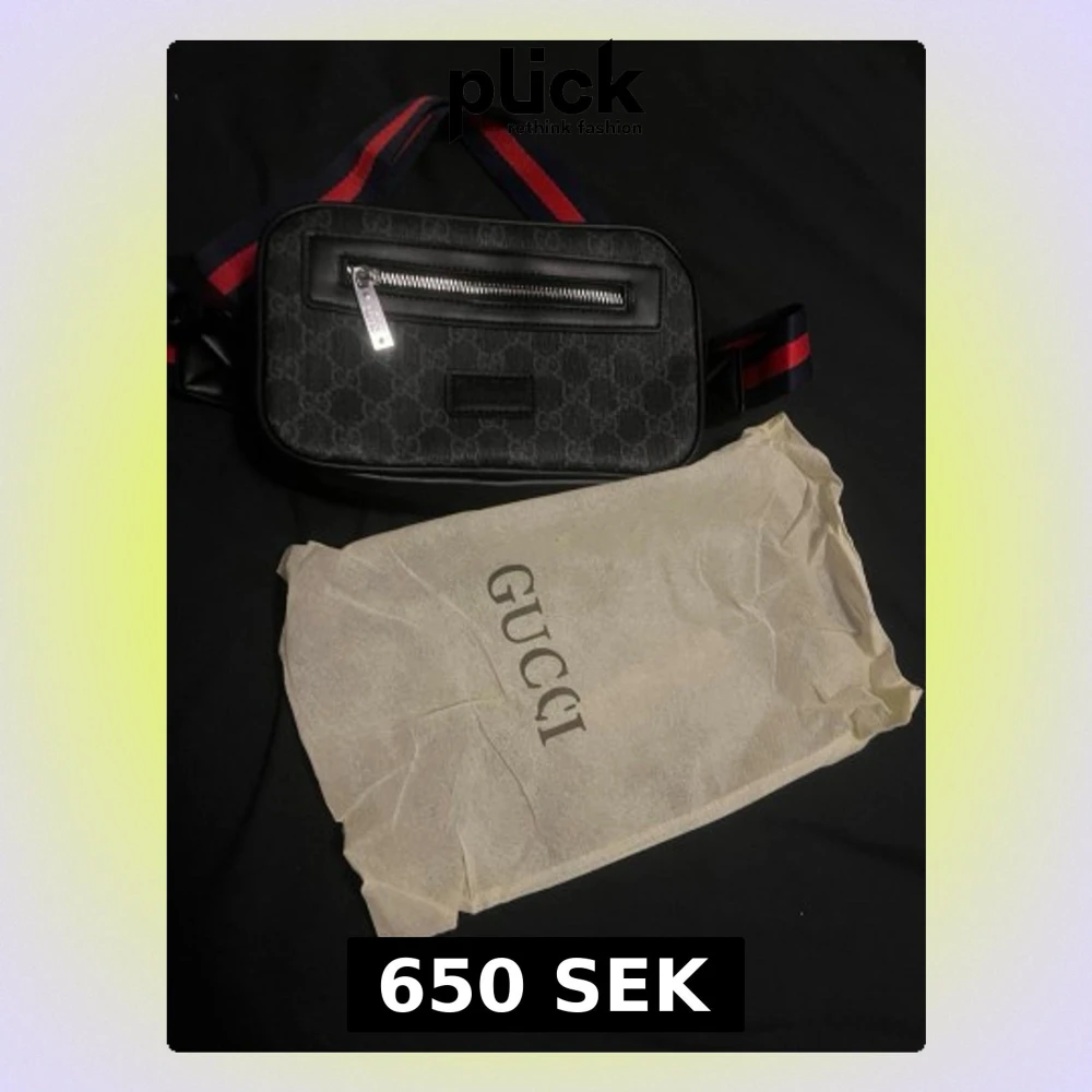 Säljer en svart axelväska med klassiskt GG-mönster och silverfärgad dragkedja framtill. Väskan har justerbart band i marinblått och rött, samt detaljer i skinn. Insidan är fodrad och har en innerficka. Perfekt för dig som vill ha en stilren och lyxig accessoar.