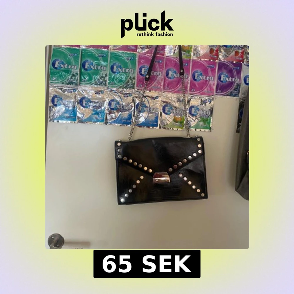 Snygg svart axelväska med coola nitar och en kedja som axelrem. Väskan har en unik design med en metallspänne framtill. Perfekt för att ge din outfit en edgy touch.
