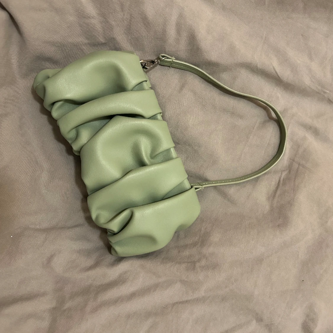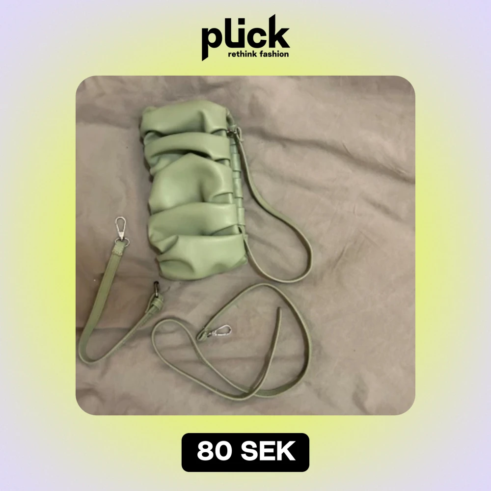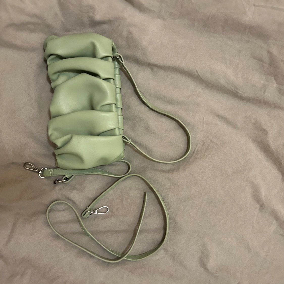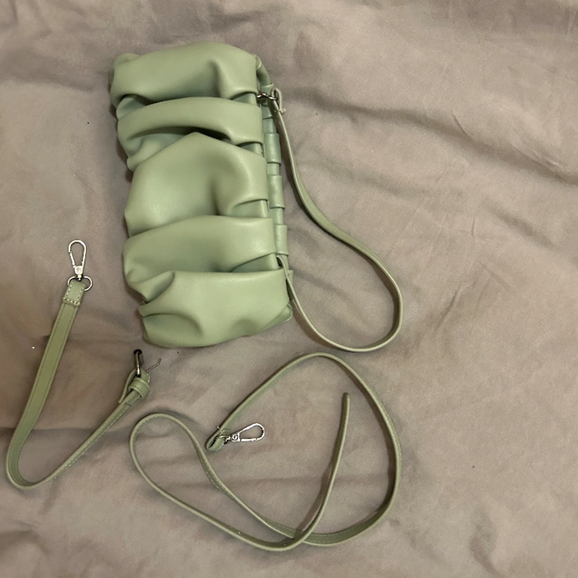 Liten justerbar väska som går att ha i olika längder. Olivgrön i skinimmitation, nyskick.