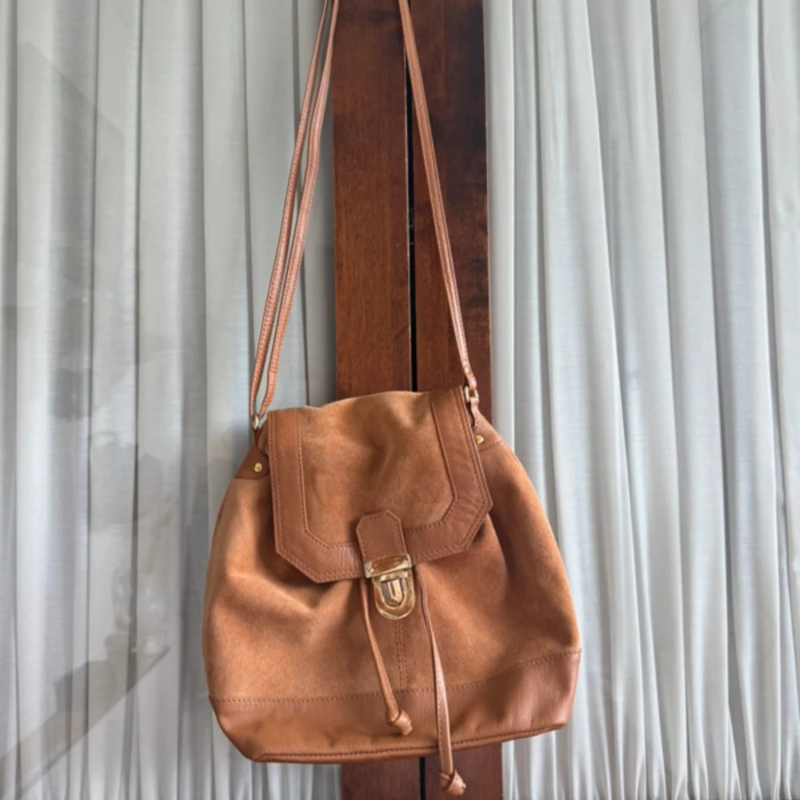 Snygg axelväska i brun mocka med detaljer i skinn. Väskan har snörning och ett lock med spänne i metall. Perfekt storlek för att få plats med allt du behöver och har en avslappnad men stilren look.