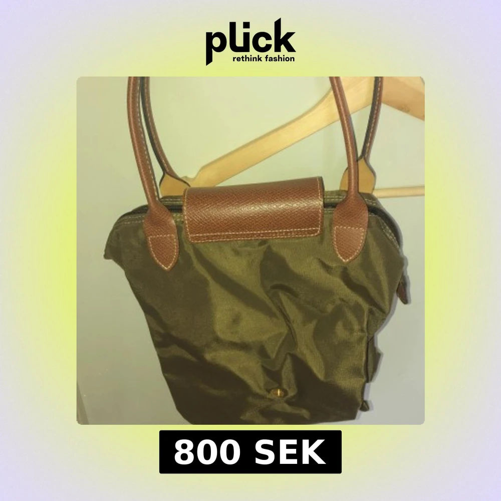 Säljer en stilren grön axelväska från Longchamp med bruna skinnhandtag och detaljer. Väskan har en praktisk dragkedja och en knappstängning på framsidan. Perfekt för att bära med sig det nödvändigaste med stil.