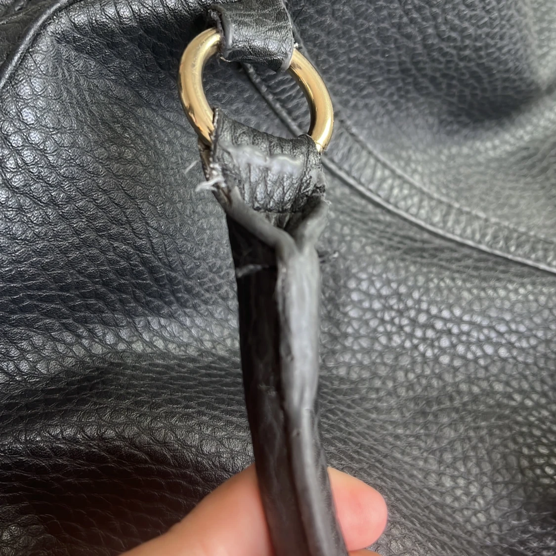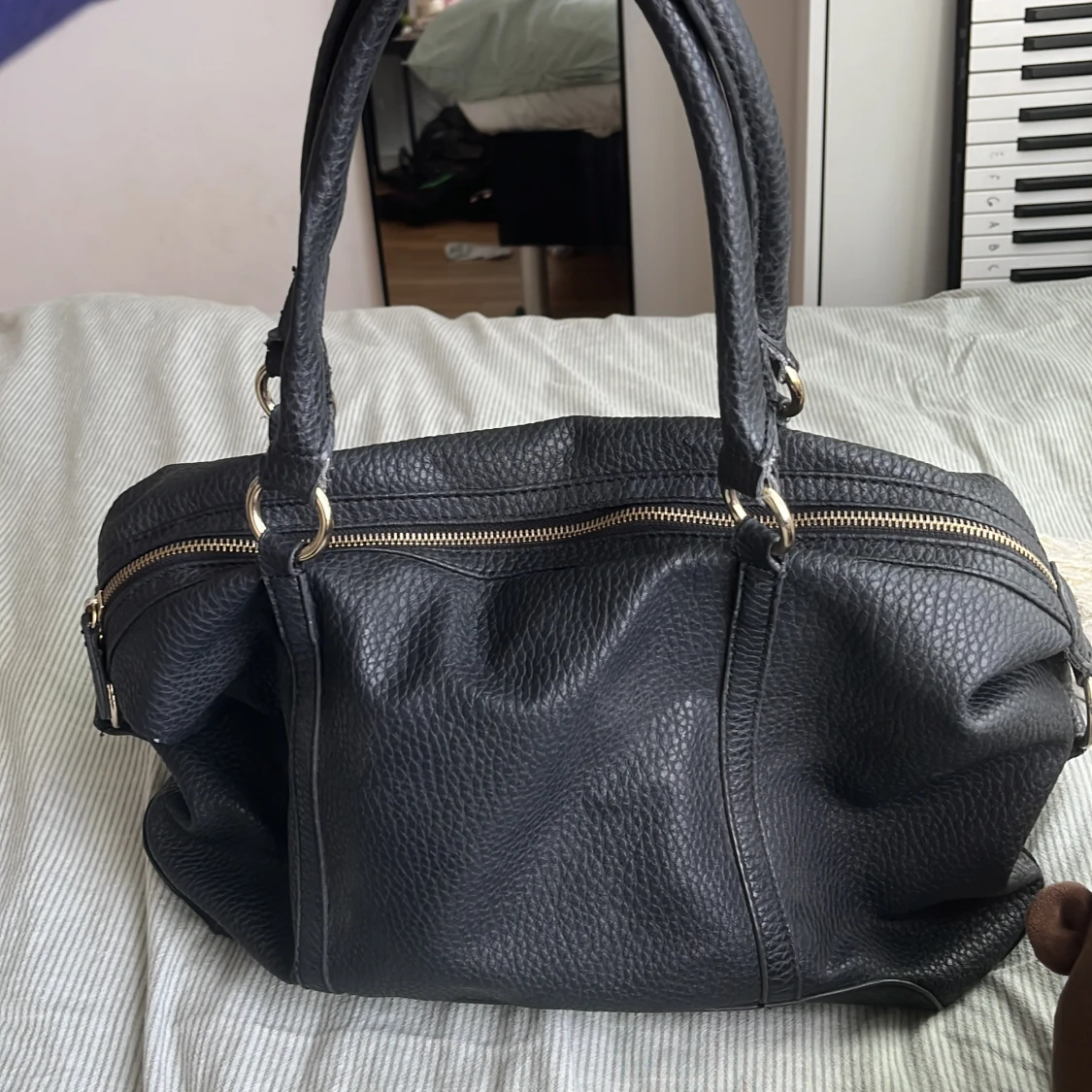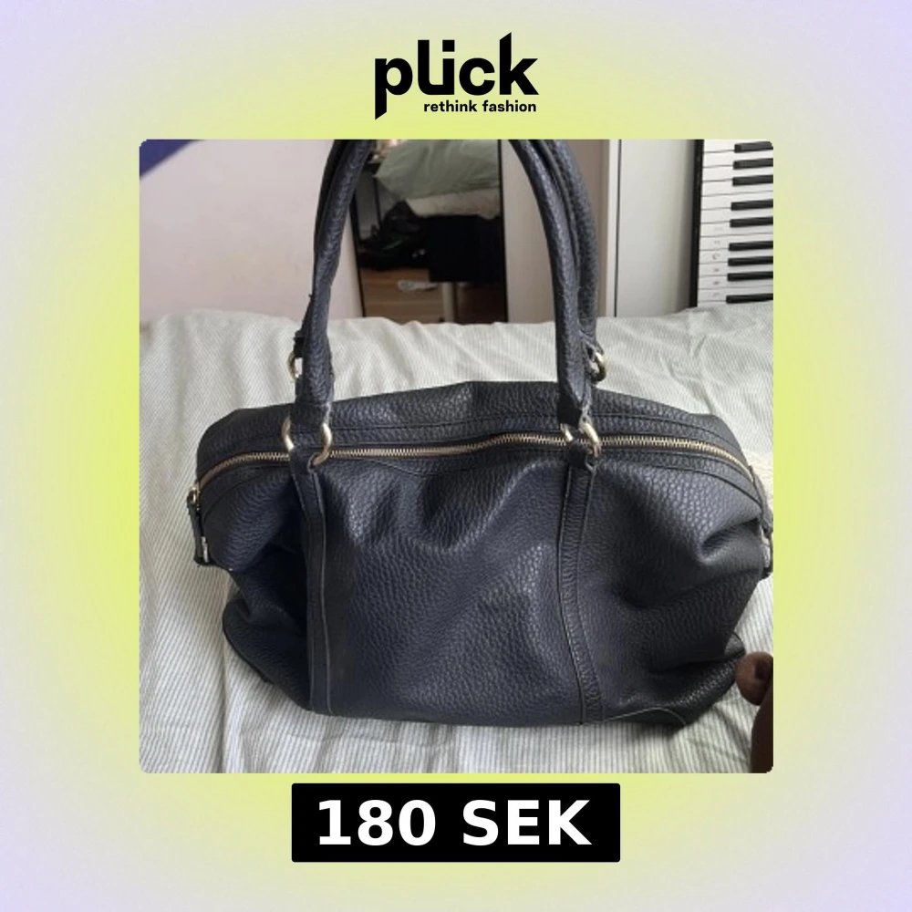 Snygg svart handväska i kraftigt, strukturerat skinn med två rejäla handtag och guldfärgade ringar. Väldigt bra skick enda defekten är att de finns lite lösa trådar men de går enkelt att klippa bort. Väskan har en stor dragkedja upptill och flera fack, perfekt för att få plats med allt du behöver. Stilren och klassisk design som funkar till många outfits💖