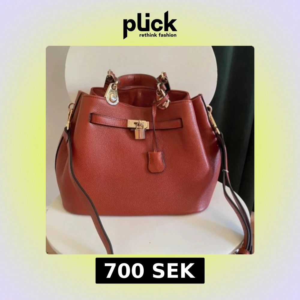 Snygg brun handväska från Noble Bags med guldfärgade metalldetaljer och lås framtill. Väskan har både handtag och axelrem, vilket gör den enkel att bära. Stilren design med struktur i materialet och praktiska fack inuti. Jag har gjort extra hål i axelremmen för att kunna göra den kortare. Den är 35 cm bred, 20 cm djup och 24 cm hög.