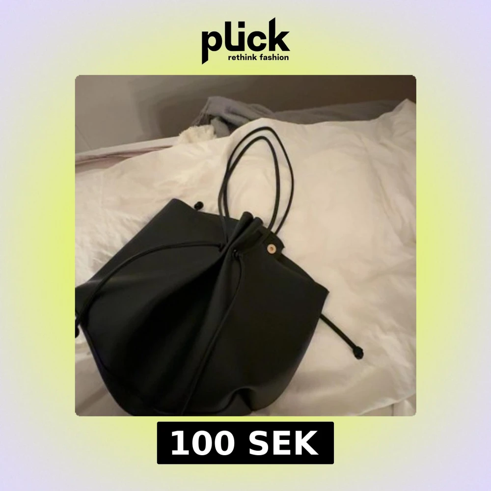 Snygg svart bucket bag med dragsko och långa axelband. Väskan har minimalistisk design och är gjord i slät skinnimitation. Perfekt storlek för att få plats med allt du behöver och passar till många olika outfits.