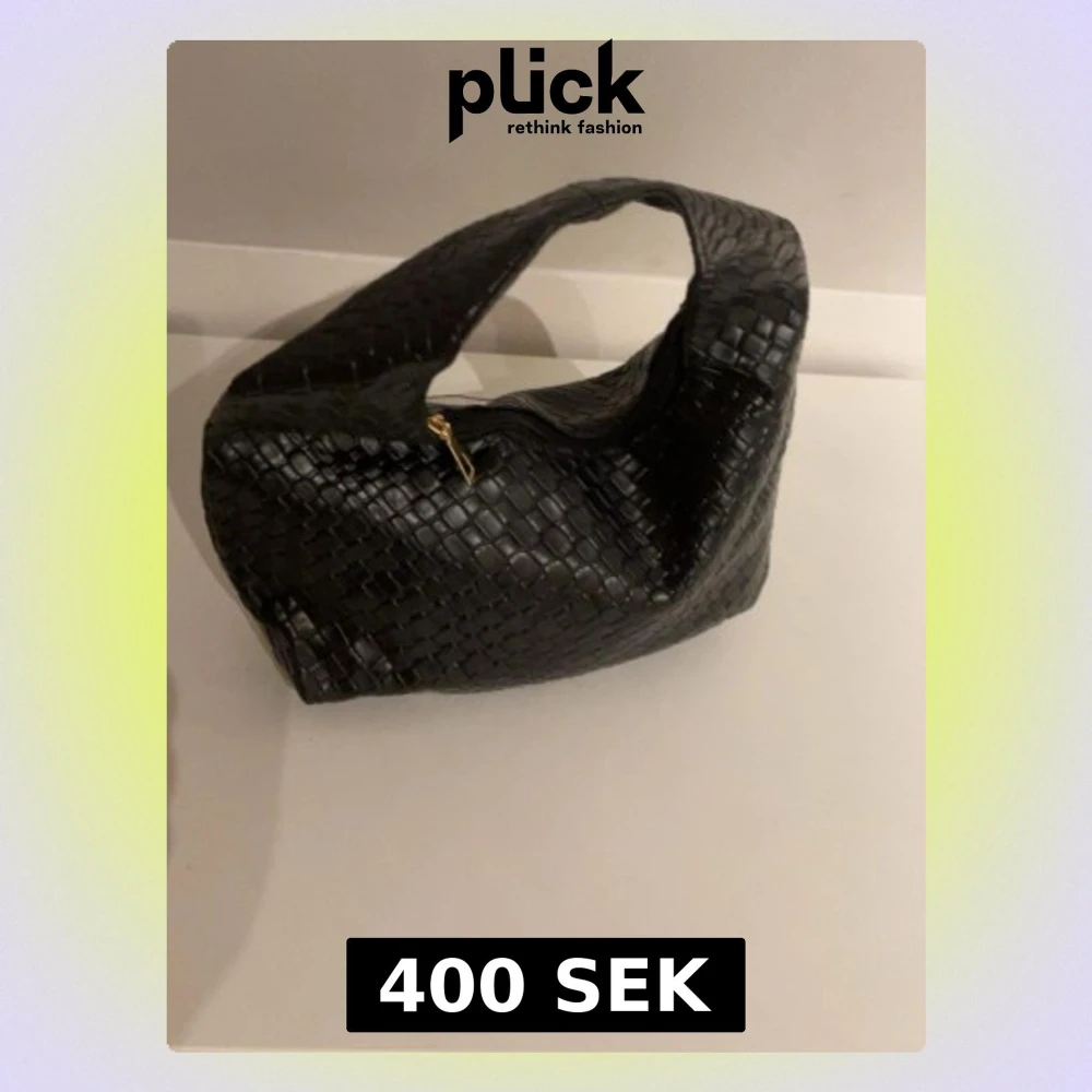Trendig svart handväska med flätad design och bred axelrem. Väskan har en mjuk, rundad form och stängs med en guldfärgad dragkedja. Perfekt accessoar för att lyfta din outfit.