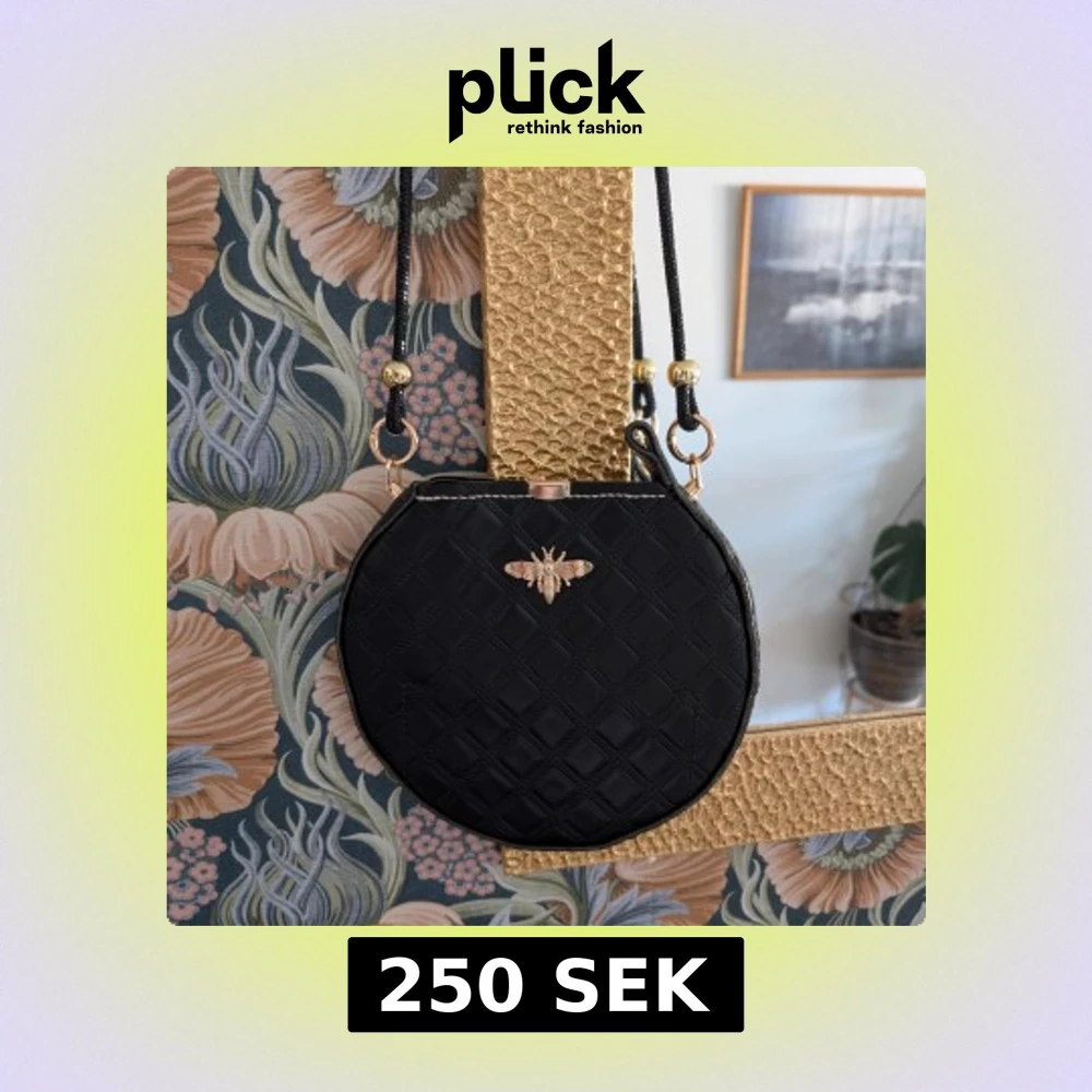 Säljer en svart rund axelväska med quiltat mönster och snygga gulddetaljer. Väskan har ett dekorativt guldfärgat bi framtill och dragkedja upptill. Axelremmen är svart med guldfärgade metalldetaljer. Perfekt accessoar för att lyfta din outfit.