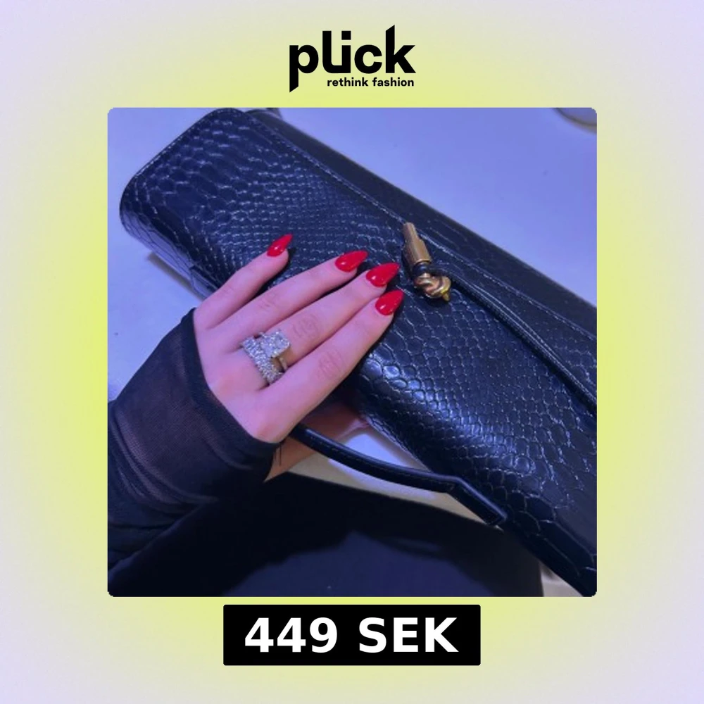 Säljer en svart kuvertväska i skinn med snygg ormskinnsstruktur och guldfärgad vridknäppning. Väskan har stilren design och ett smalt handtag, perfekt för att lyfta din outfit med en edgy touch. Endast använt en gång. Fick många komplimanger