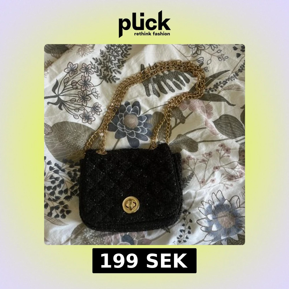 Snygg svart axelväska med glittrig yta och guldig kedjerem. Väskan har ett quiltat tyg och ett vridlås i guld framtill. Perfekt storlek för det viktigaste och ger en lyxig känsla till din outfit.