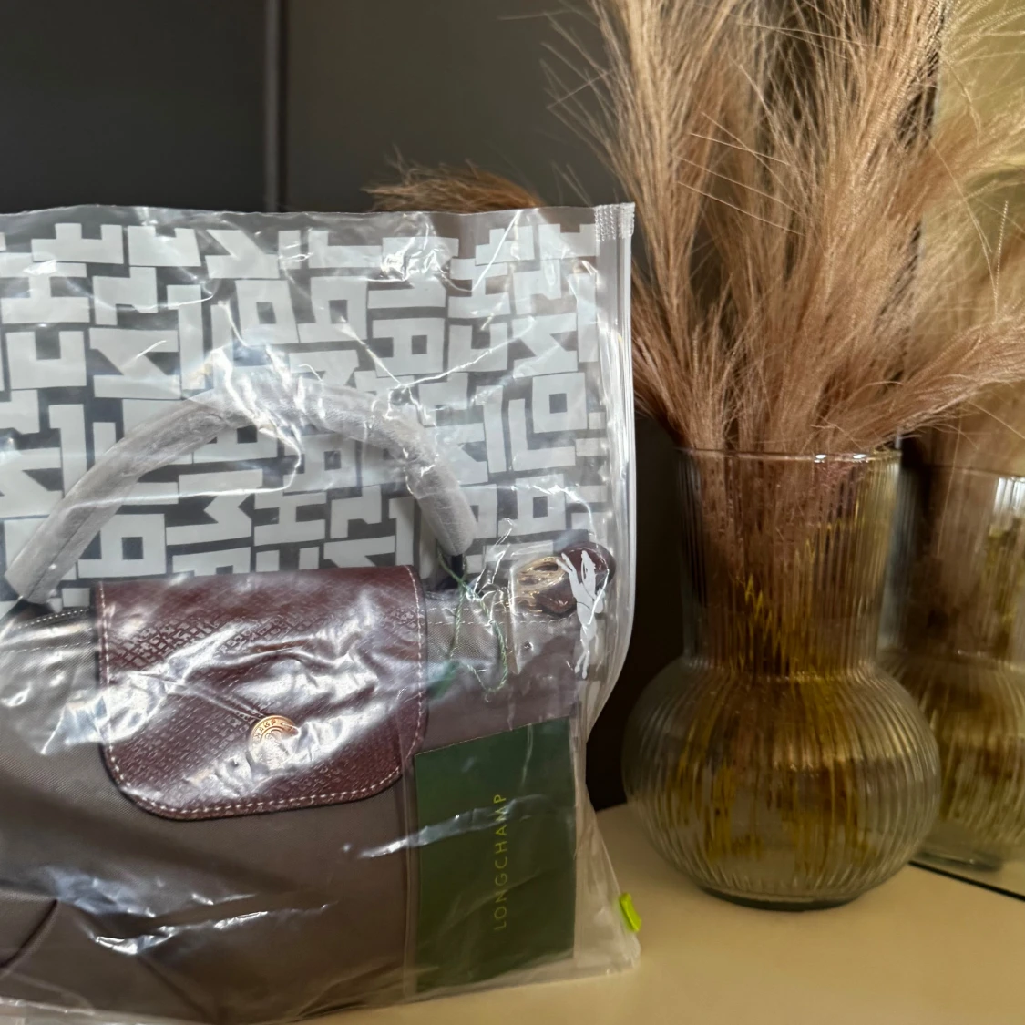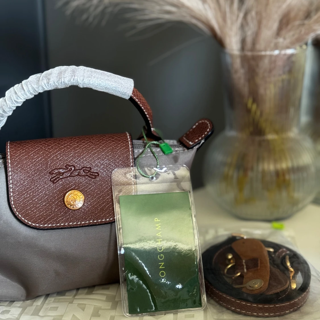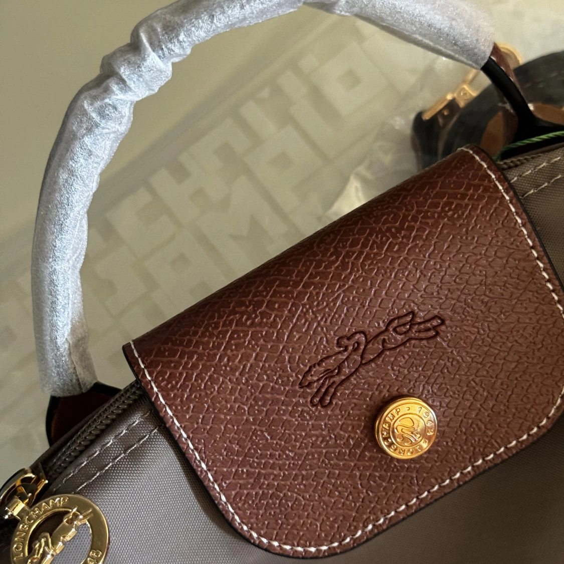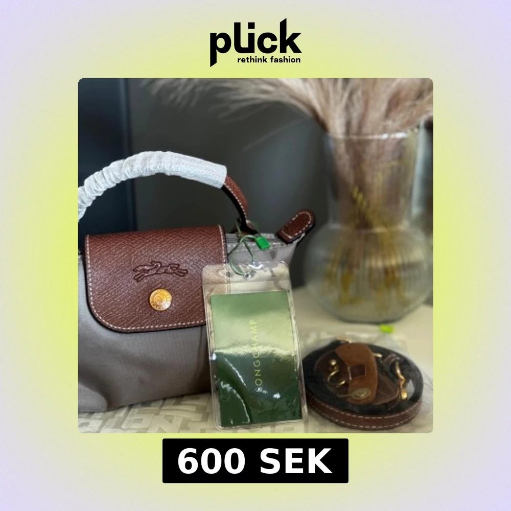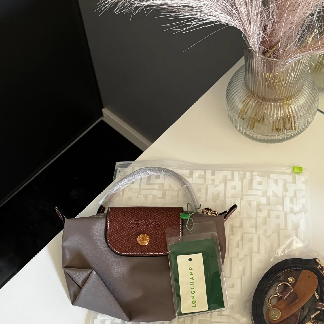 Snygg handväsk i brun/grått med bruna detaljer i skinn. Väskan har guldiga metalldetaljer, klassisk knappstängning och präglad logotyp på locket. Kommer med axelrem och påse. Perfekt storlek för det viktigaste. Skriv privat för fler frågor och innan du beställer. 💕