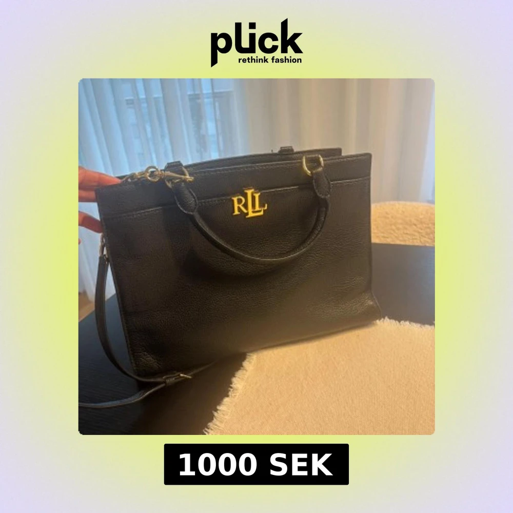Stilren svart handväska i skinn från Ralph Lauren med guldfärgade detaljer och logotyp framtill. Väskan har både handtag och axelrem, samt flera fack och dragkedja upptill. Perfekt för dig som vill ha en klassisk och snygg accessoar. Köpt för 2500. Säljer för 1000 pris kan diskuteras .