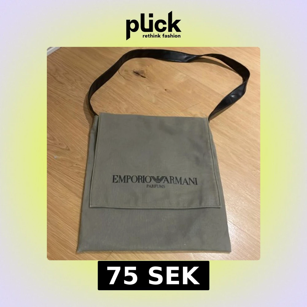 Stilren beige/grön axelväska från Emporio Armani Parfums i canvas med svart logga framtill. Väskan har ett stort fack med innerficka med dragkedja och bred axelrem i svart konstläder. Perfekt för att bära med sig det viktigaste till skolan eller stan. Storlek 36x36cm.