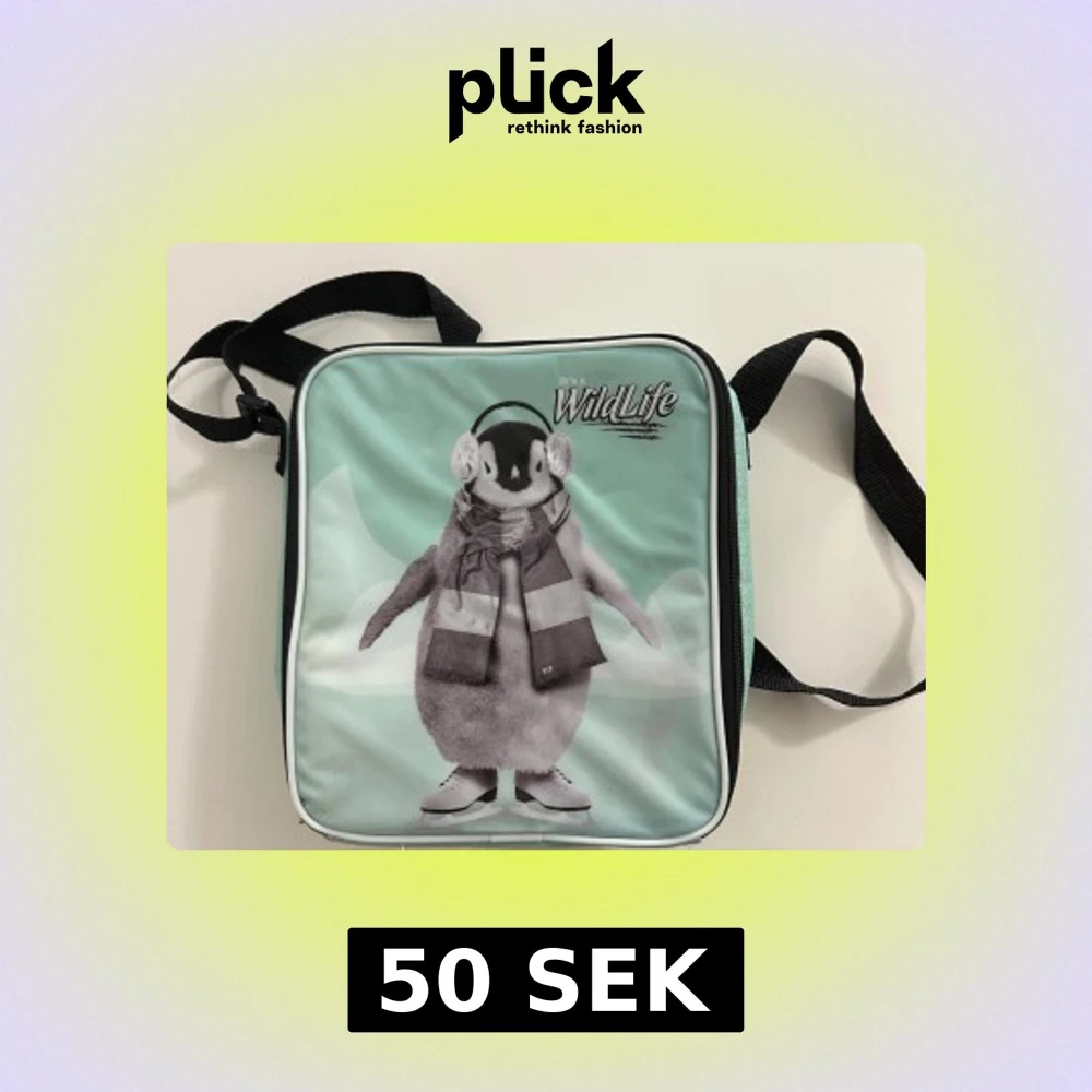 Cool axelväska med mintgrön framsida och ett pingvinmotiv med hörlurar och halsduk. Väskan har svart justerbar axelrem och dragkedja runt hela. Insidan är silverfärgad och isolerad, perfekt för att hålla saker kylda. Trycket är unikt och väskan är fyrkantig i formen.