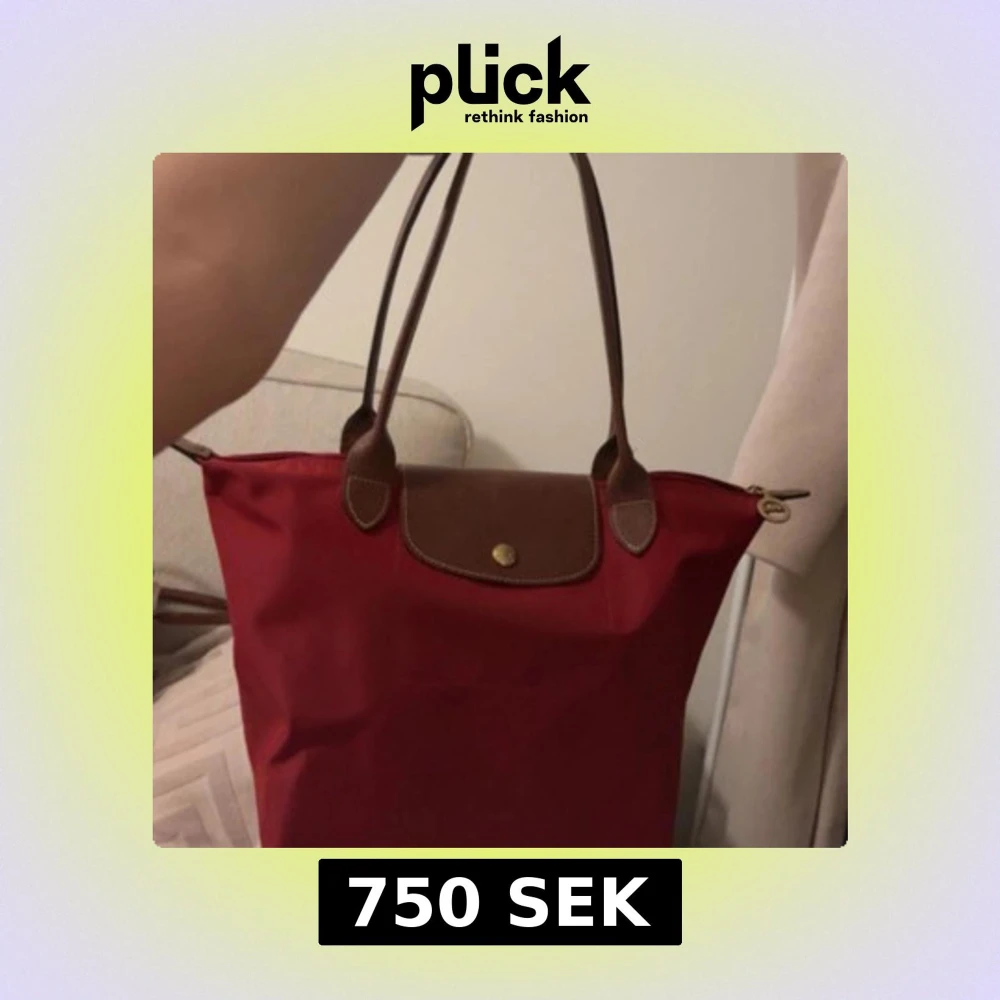 Snygg röd handväska från Longchamp med bruna skinnhandtag och lock. Väskan har klassisk form, guldfärgade detaljer och dragkedja upptill. Perfekt för dig som vill ha en stilren och rymlig väska till vardagen.