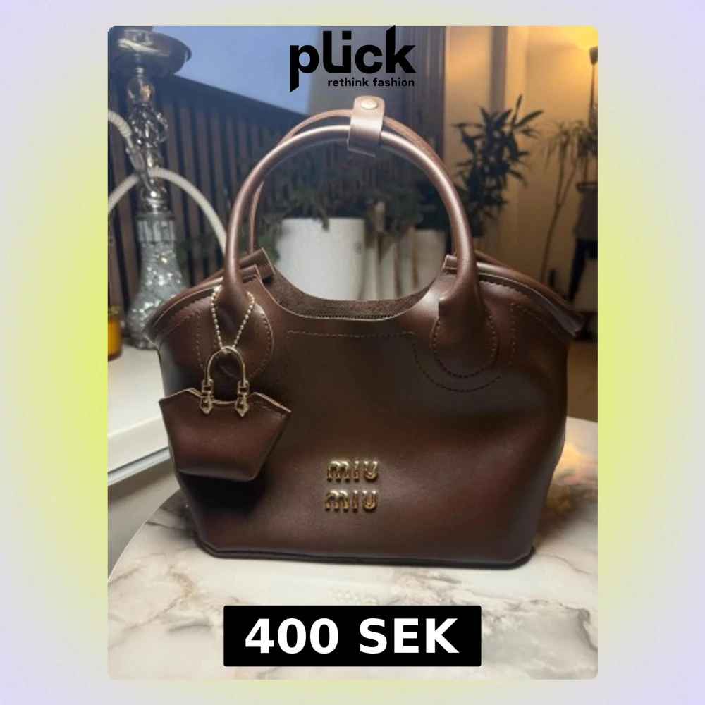Säljer en brun handväska från Miu Miu i slätt skinn med guldfärgade detaljer och logga framtill. Väskan har rundade handtag, en liten matchande miniväska som dekoration och dragkedja upptill. Perfekt accessoar för dig som gillar stilrena och lyxiga detaljer.