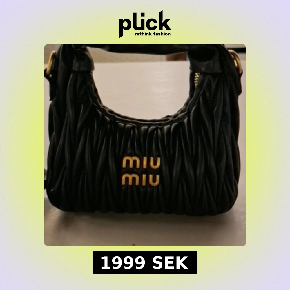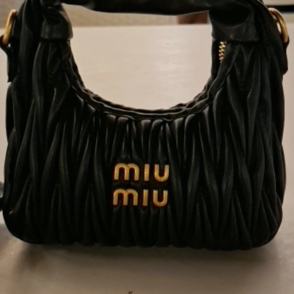 Snygg svart handväska från Miu Miu med quiltad design och guldiga detaljer. Väskan har ett mjukt, puffigt handtag och en praktisk dragkedja upptill. Materialet är skinn och loggan i guld ger en lyxig vibe. Perfekt storlek för det viktigaste.