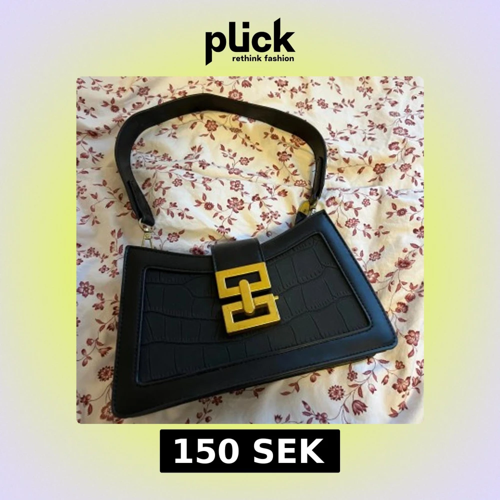 Snygg svart axelväska med croco-mönstrad yta och ett stort, stilrent guldspänne framtill. Väskan har en bred axelrem och rektangulär form som ger en cool vibe. Perfekt för dig som gillar statement-detaljer och trendiga accessoarer.
