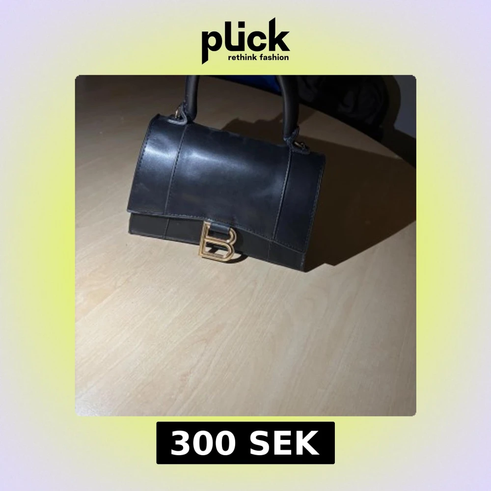 Säljer en stilren svart handväska med ett stort B-spänne i metall framtill. Väskan har ett klassiskt, fyrkantigt format och bärhandtag upptill. Perfekt för dig som gillar tidlös design och vill ha en ikonisk accessoar.