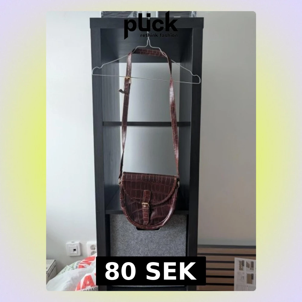 Säljer en brun axelväska med krokopräglat mönster och justerbar rem. Väskan har ett snyggt spänne framtill och är tillverkad i skinn. Perfekt storlek för det viktigaste och ger en cool vibe till din outfit. Står "Made in Italy"