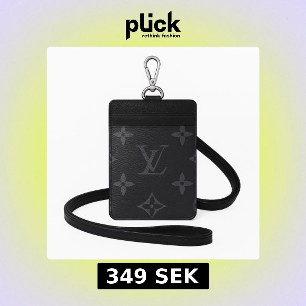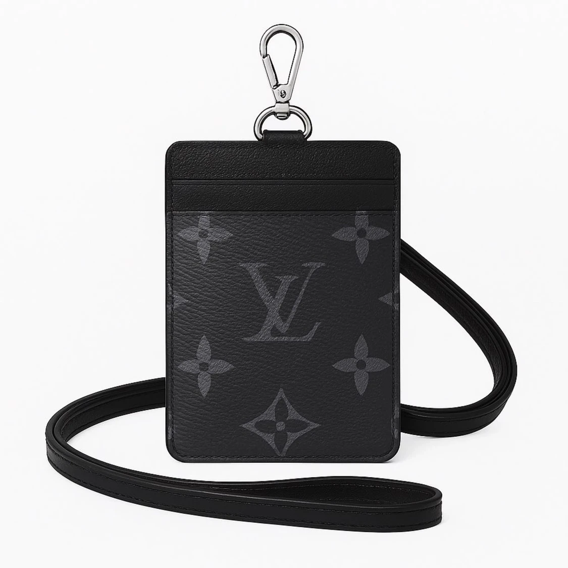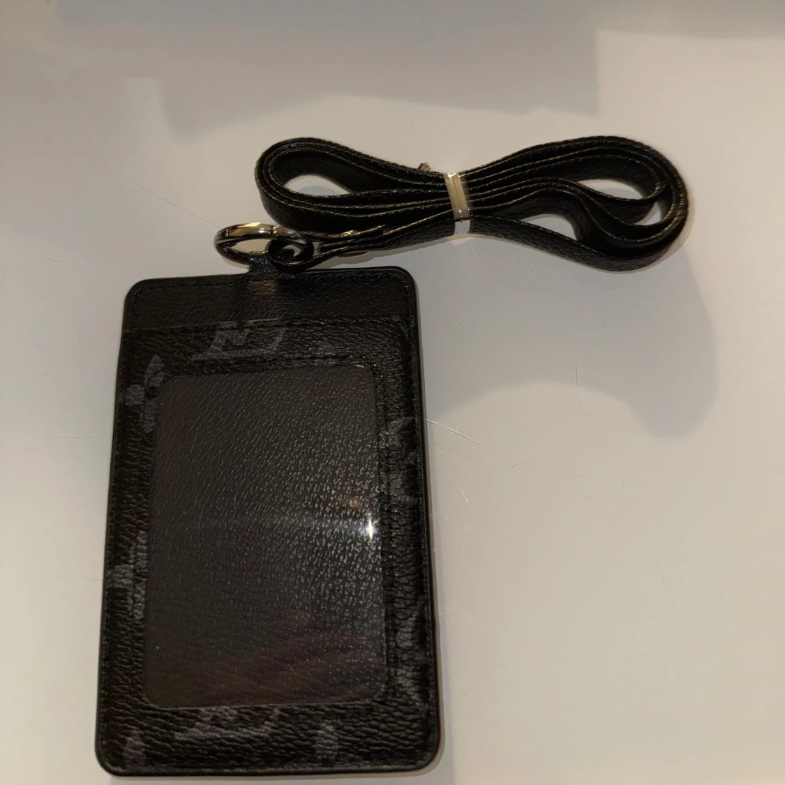 Snygg svart korthållare med klassiskt monogrammönster i grått. Kommer med en lång rem och metallklämma för att enkelt bära runt halsen. Perfekt för kort, ID eller nycklar. Tillverkad i exklusivt skinn med stilren design och fönster på baksidan.