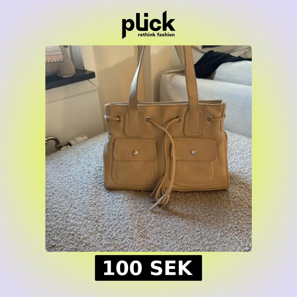 Snygg beige axelväska i skinn med två stora fickor framtill och cool snörningsdetalj upptill. Väskan har långa handtag som gör den enkel att bära på axeln och en stilren, fyrkantig form. Perfekt för dig som vill ha plats för allt du behöver i vardagen.