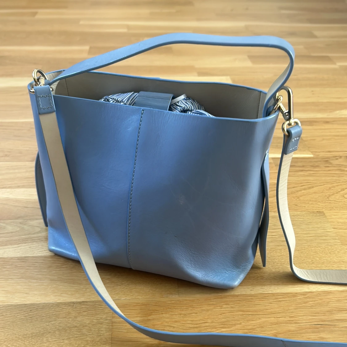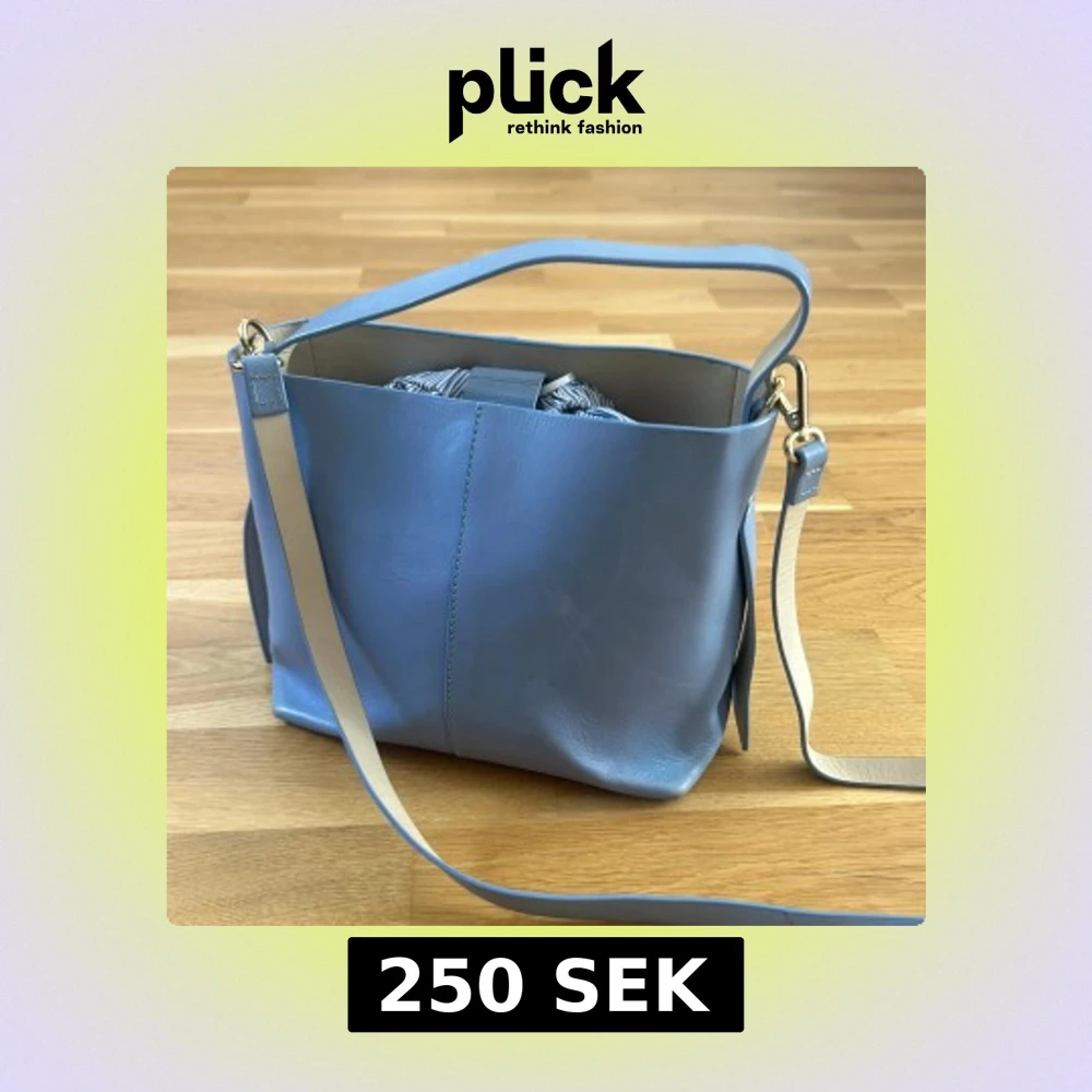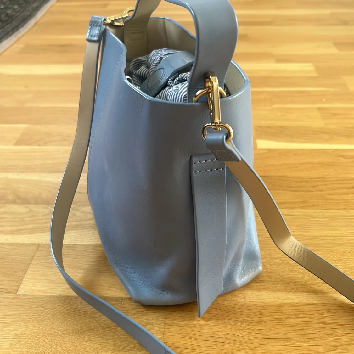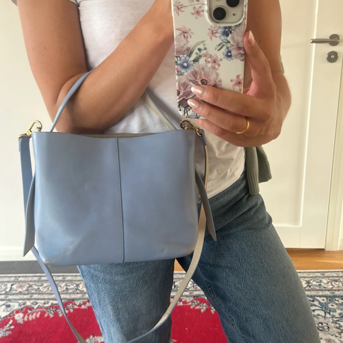 Snygg ljusblå axelväska i slätt skinn med stilrena guldfärgade metalldetaljer. Väskan har både axelrem och handtag, samt en rymlig insida med ett randigt innerfoder. Perfekt för dig som vill ha en trendig och praktisk väska med minimalistisk look.