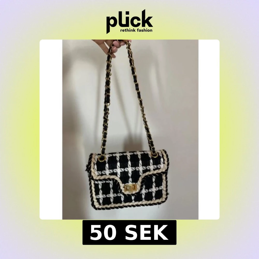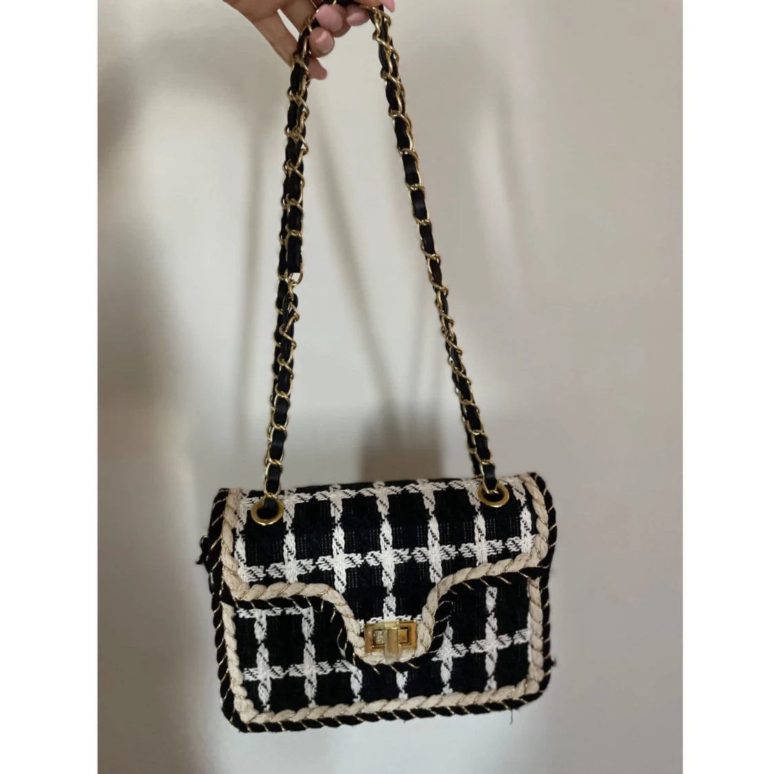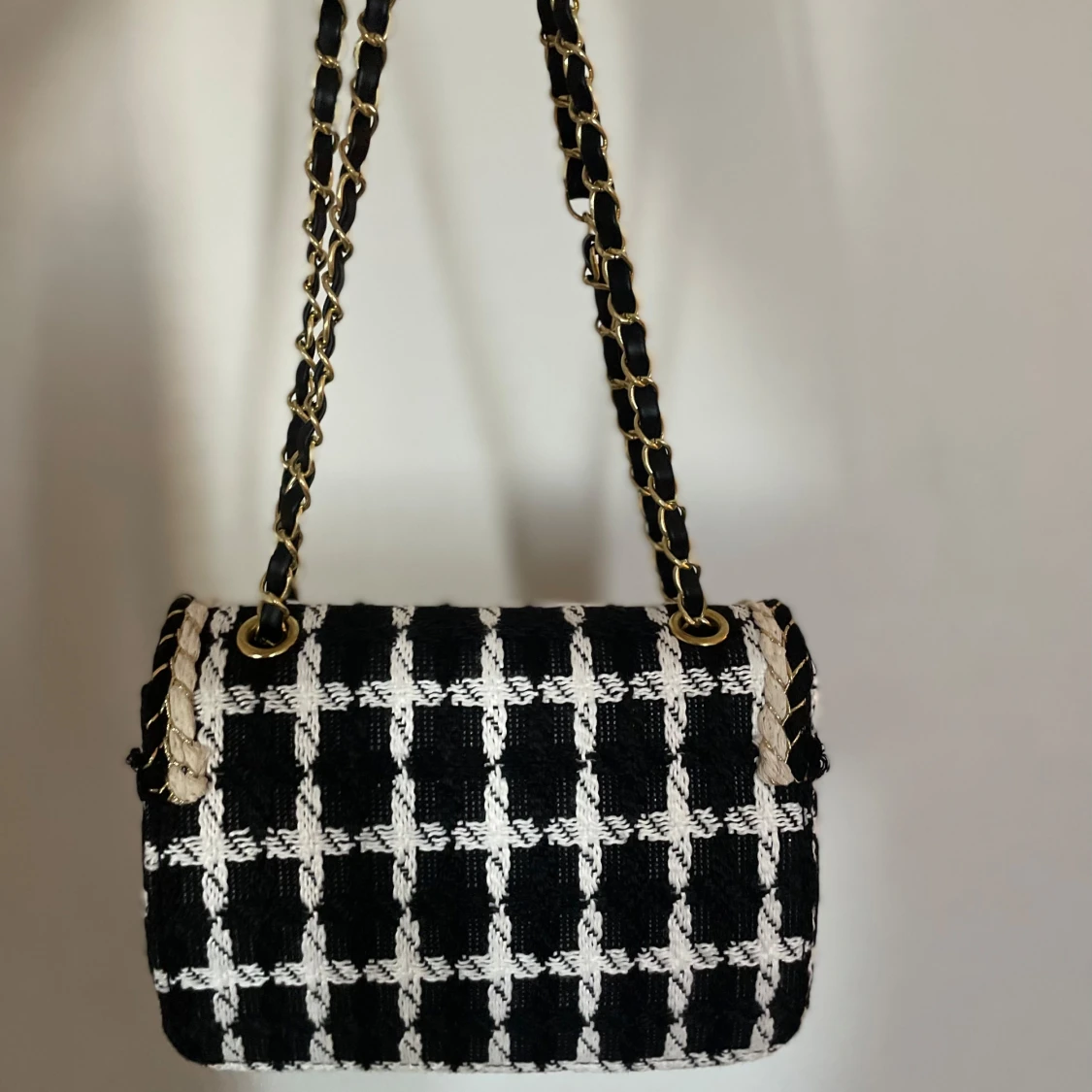 Snygg axelväska i svart och vitt rutigt tyg med flätade kanter och guldfärgad kedja i axelremmen.