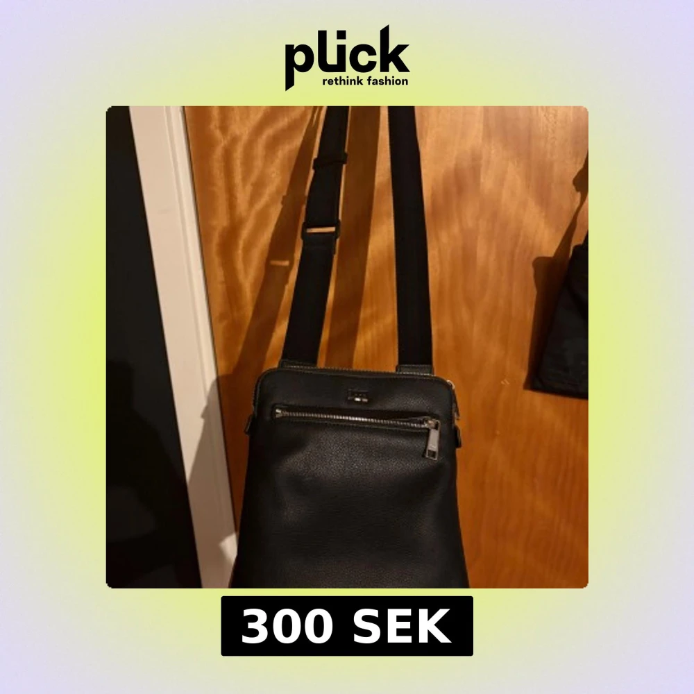 Säljer en stilren svart axelväska i skinn med justerbar rem och praktisk dragkedja framtill. Perfekt storlek för att få plats med det viktigaste och passar till många olika outfits. Enkel och clean design som funkar till det mesta.