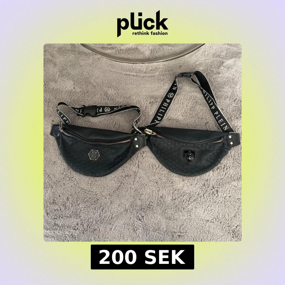 Säljer en svart magväska från Philipp Plein med coolt mönster och detaljer. Väskan har ett präglat PP-mönster, silvrig dragkedja med rakbladshänge och bred axelrem med logga. Framsidan har en emblem med panterhuvud och en med PP 78. Perfekt för att lyfta din streetstyle. 200kr st