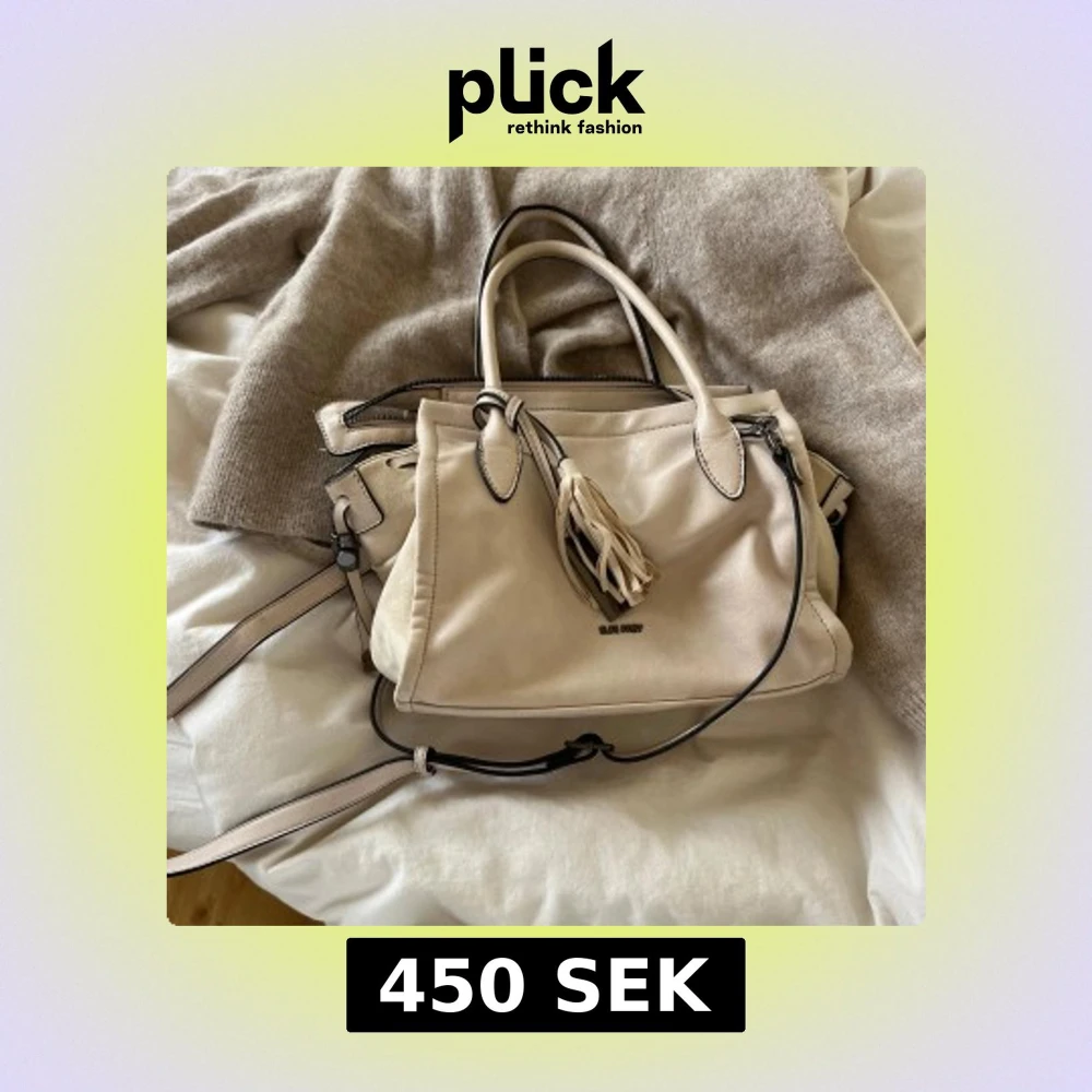Snygg beige handväska från Suri Frey med tofsdetalj framtill. Väskan har både handtag och axelrem, dragkedja upptill och ett rymligt foder med tryckt logga. Perfekt storlek för vardagens essentials och stilren look.