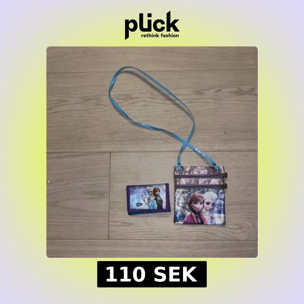 Säljer en söt axelväska med motiv från Frozen och matchande plånbok. Väskan har blå axelrem, två dragkedjor och glittrig lila framsida. Plånboken är lila med snöflingor och Frozen-tryck. Perfekt för barn som älskar Disney och vill ha med det viktigaste.