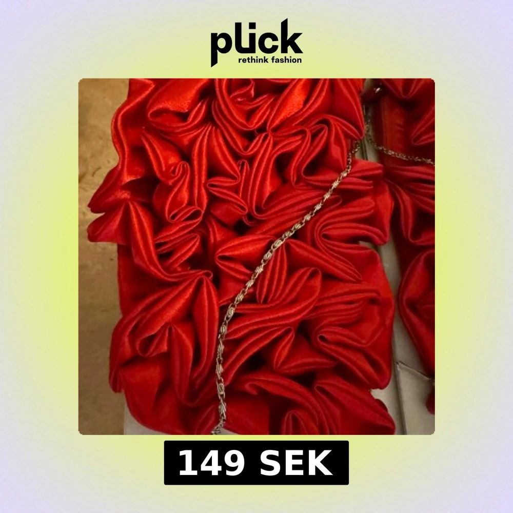 Säljer en riktigt snygg röd axelväska med coola volangdetaljer på framsidan. Väskan har en kedja som axelrem och är gjord i glansigt satinliknande material. Stängs med dragkedja och har en unik, iögonfallande design som verkligen sticker ut.