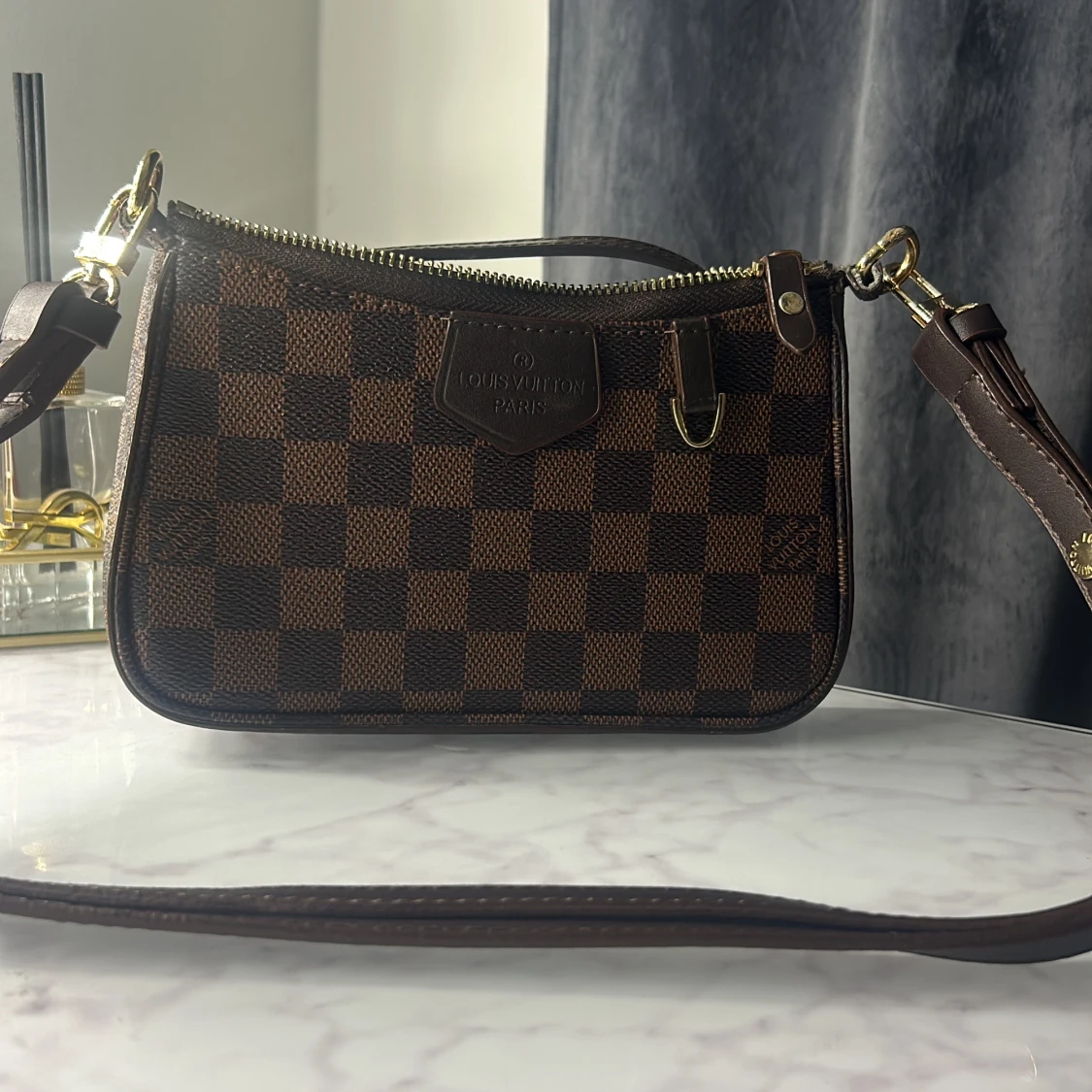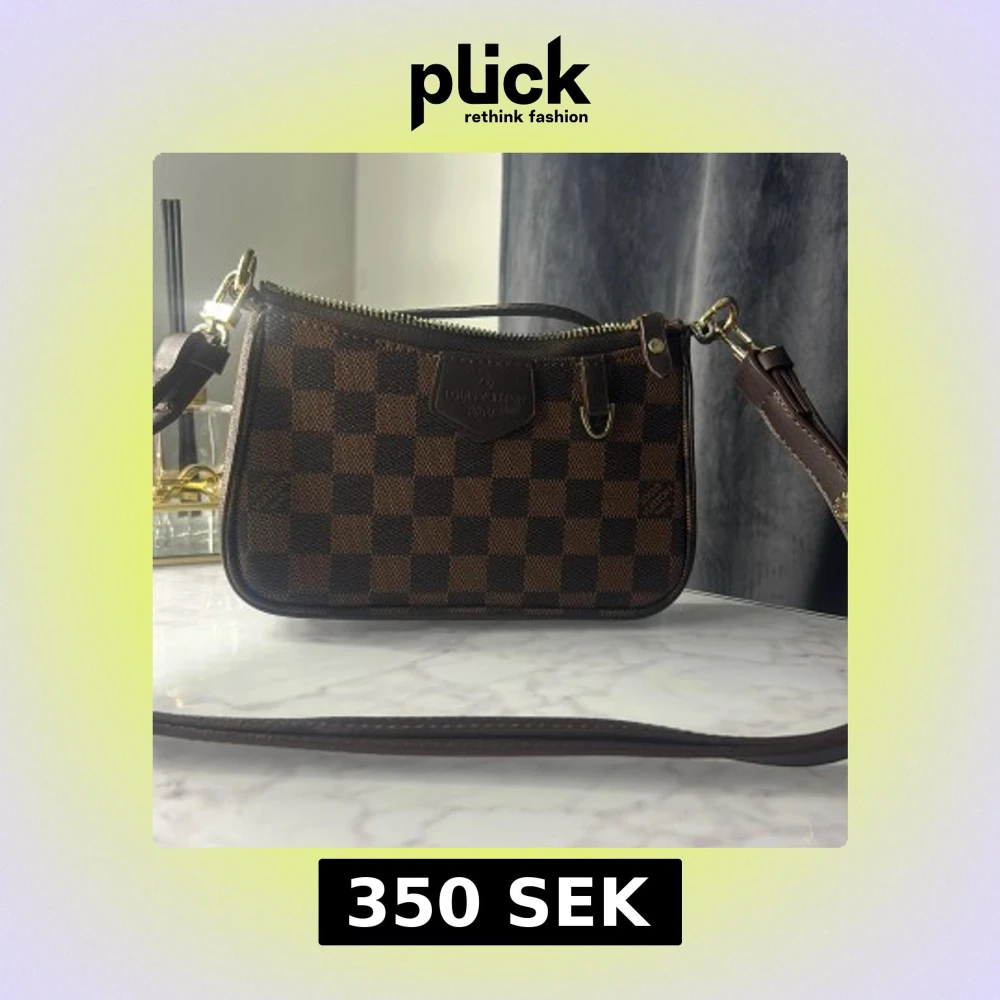 Snygg axelväska i klassiskt brunt rutigt mönster. Väskan har guldfärgade metalldetaljer, dragkedja och justerbar axelrem. Perfekt storlek för det viktigaste och en ikonisk accessoar till din outfit. Gått sönder lite vid handtaget