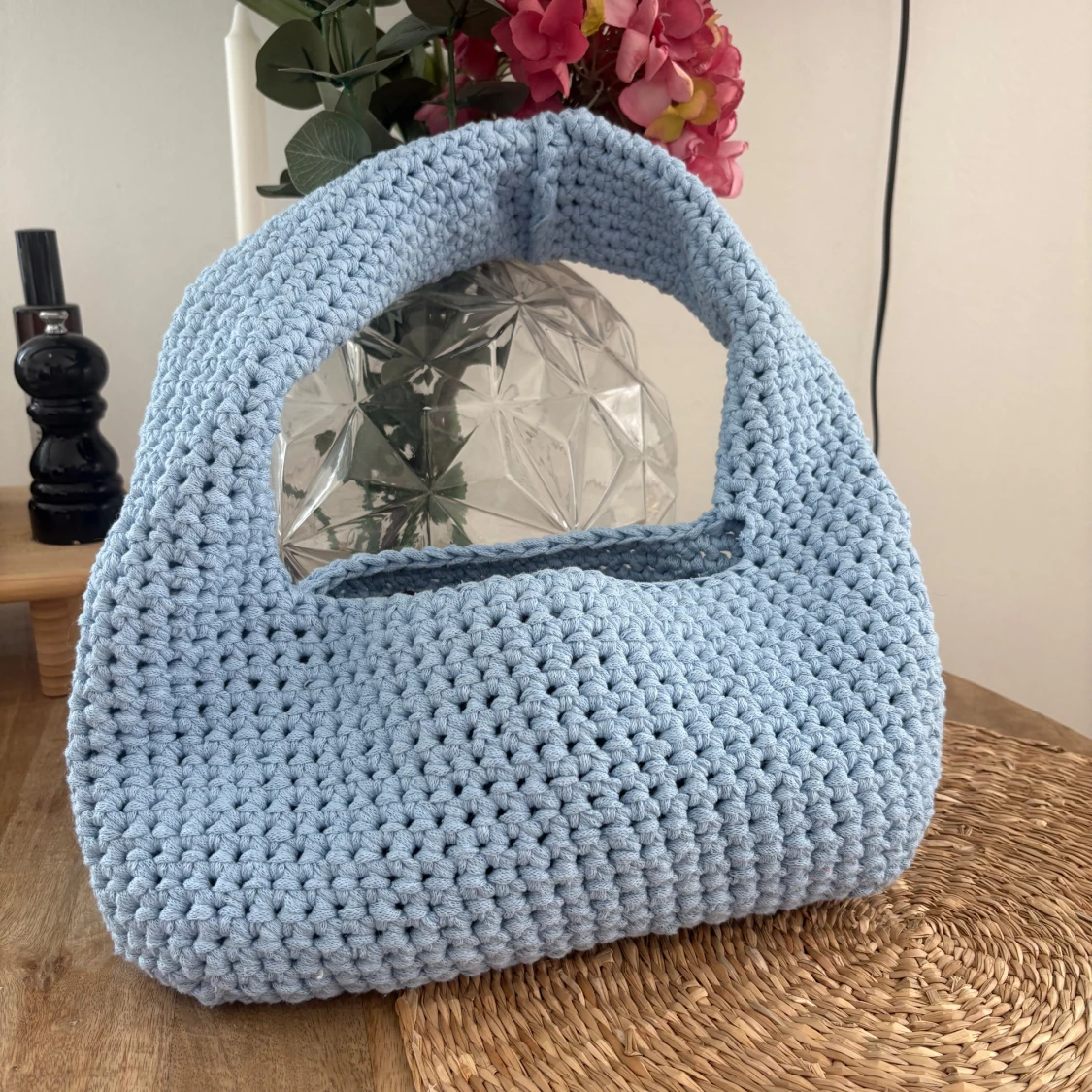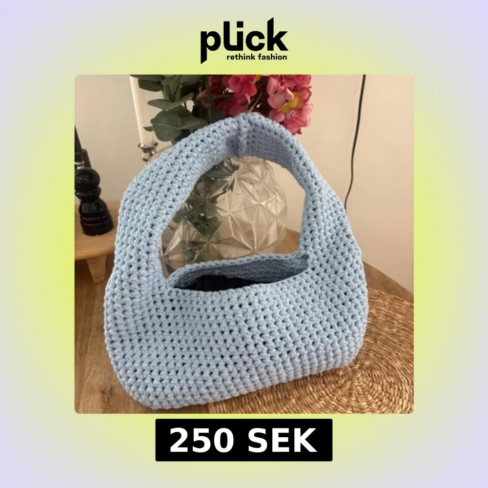 Superfin ljusblå handväska i stickad design. Väskan har en mjuk och chunky känsla med bred axelrem och rymligt fack. Perfekt för dig som gillar unika accessoarer och vill addera lite färg till din outfit.